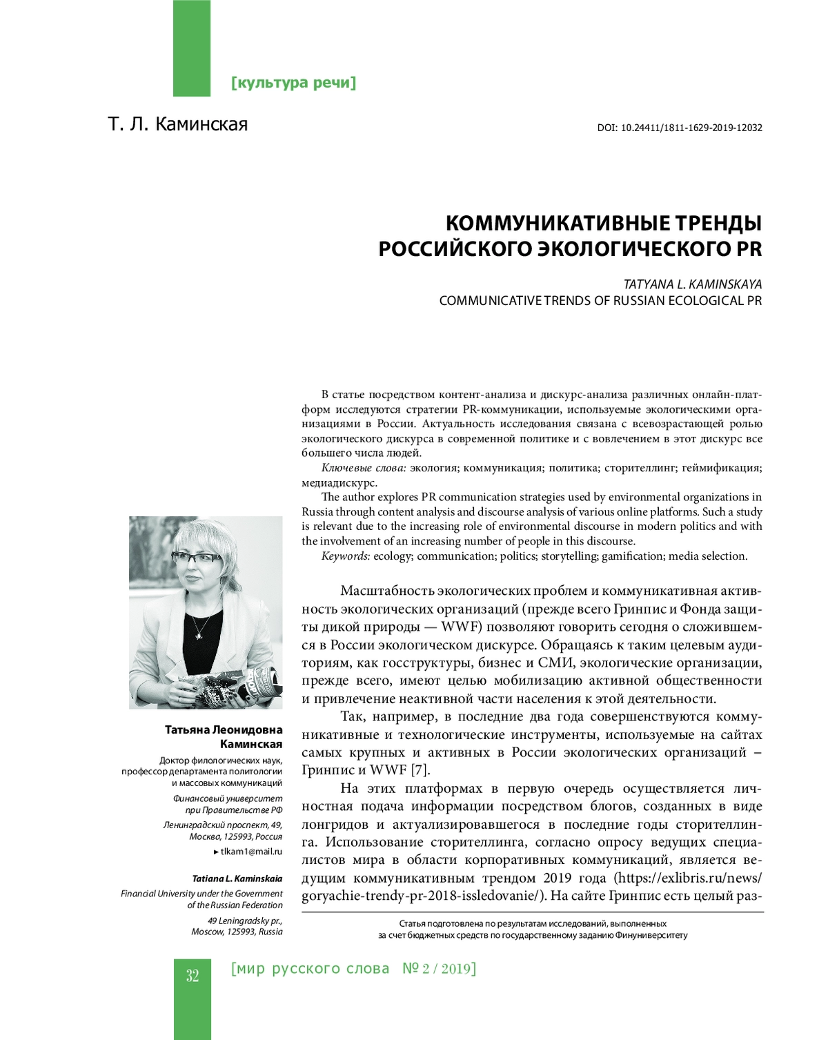 В статье посредством контент-анализа и дискурс-анализа различных онлайн-платформ исследуются стратегии PR-коммуникации, используемые экологическими организациями в России. Актуальность исследования связана с всевозрастающей ролью экологического дискурса в современной политике и с вовлечением в этот дискурс все большего числа людей