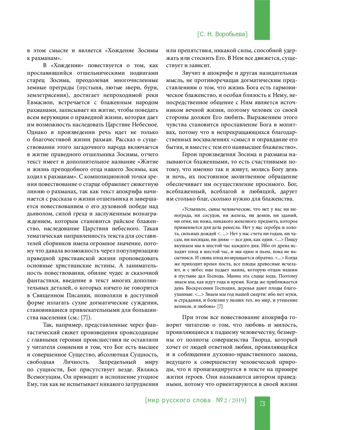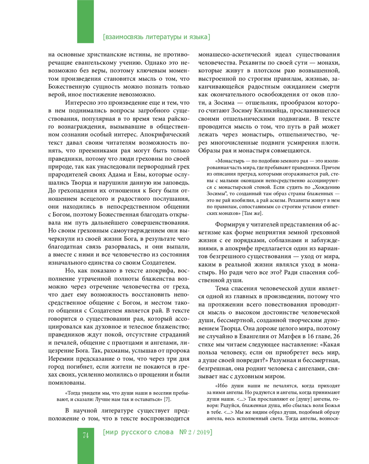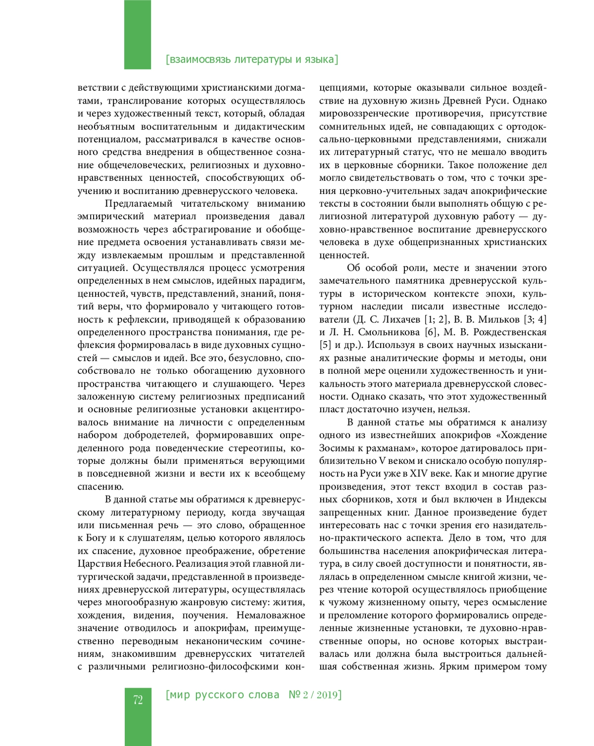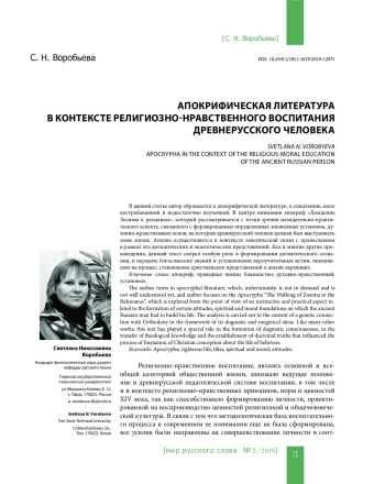 В данной статье автор обращается к апокрифической литературе, к сожалению, мало востребованной и недостаточно изученной. В центре внимания апокриф «Хождение Зосимы к рахманам», который рассматривается с точки зрения назидательно-практического аспекта, связанного с формированием определенных жизненных установок, духовно-нравственных основ, на которых древнерусский человек должен был выстраивать свою жизнь. Анализ осуществляется в контексте генетической связи с православием в рамках его догматических и экзегетических представлений. Как и многие другие произведения, данный текст сыграл особую роль в формировании догматического сознания, в передаче богословских знаний и установлении вероучительных истин, повлиявших на процесс становления христианских представлений о жизни верующих
