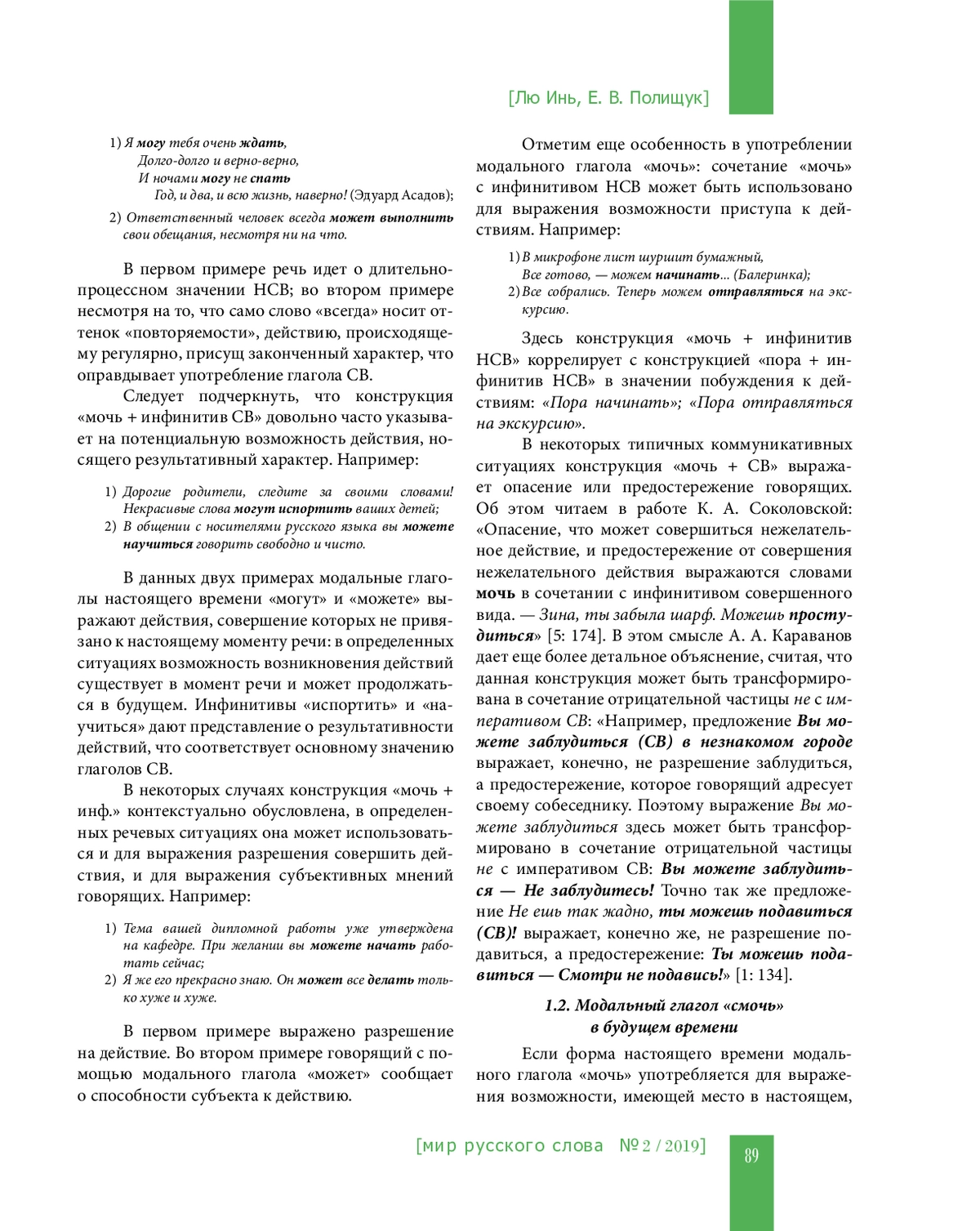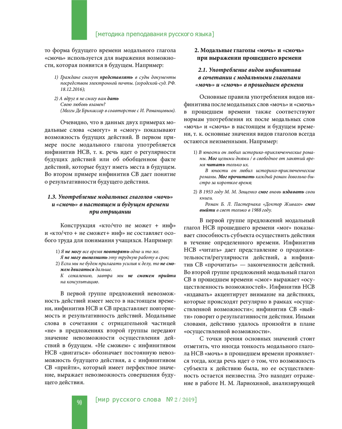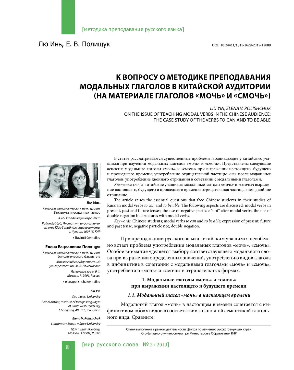 При преподавании русского языка китайским учащимся неизбежно встает проблема употребления модальных глаголов «мочь», «смочь». Особое внимание уделяется выбору соответствующего модального слова при выражении определенных значений, употреблению видов глагола в инфинитиве в сочетании с модальными глаголами «мочь» и «смочь», употреблению «мочь» и «смочь» в отрицательных формах