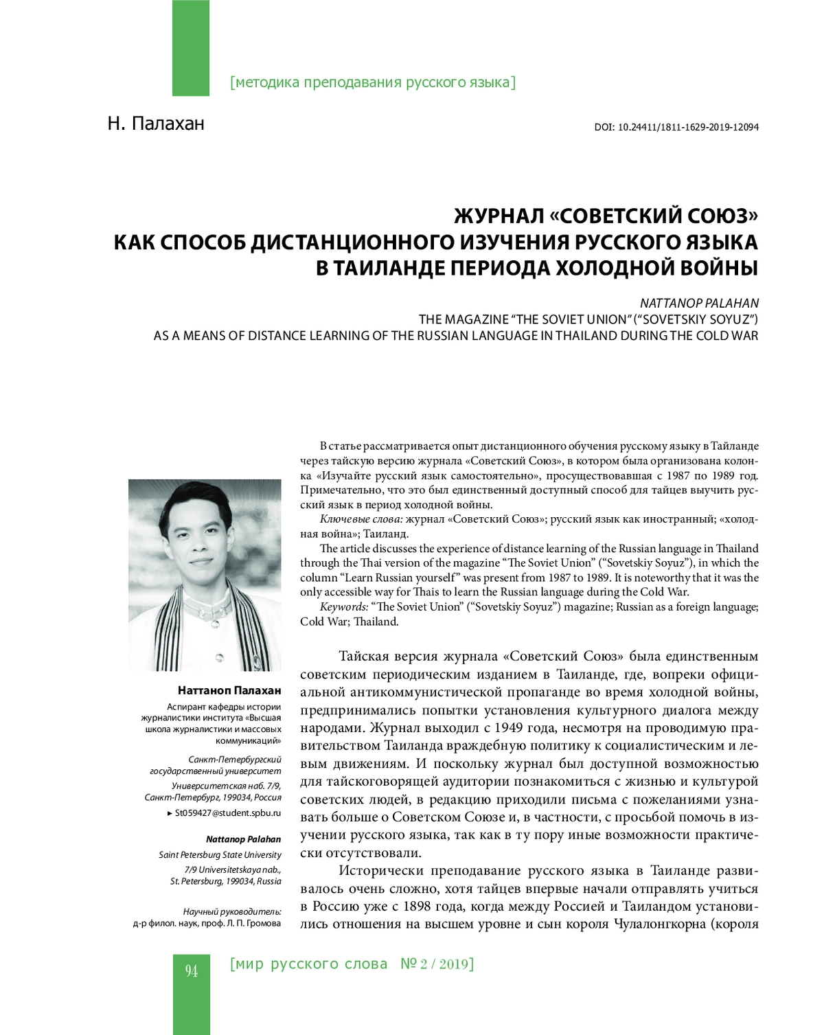 В статье рассматривается опыт дистанционного обучения русскому языку в Тайланде через тайскую версию журнала «Советский Союз», в котором была организована колонка «Изучайте русский язык самостоятельно», просуществовавшая с 1987 по 1989 год. Примечательно, что это был единственный доступный способ для тайцев выучить русский язык в период холодной войны