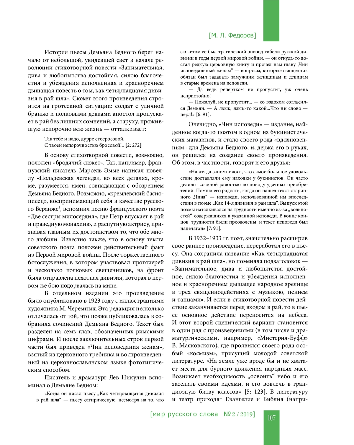 Впервые объектом сравнительного анализа становятся «Дни Турбиных» М. А. Булгакова и забытая пьеса Демьяна Бедного «Как четырнадцатая дивизия в рай шла…». Оба драматурга по заказу театров переделывают свои ранние произведения (Булгаков — роман, Демьян Бедный — стихотворную повесть) в пьесы. В статье (в том числе и на неизвестных архивных материалах из фонда Демьяна Бедного в ОР ИМЛИ) восстанавливается история создания этих произведений, анализируются не только общие мотивы обеих пьес, но и их сквозные образы (например, апостола Петра как привратника рая)