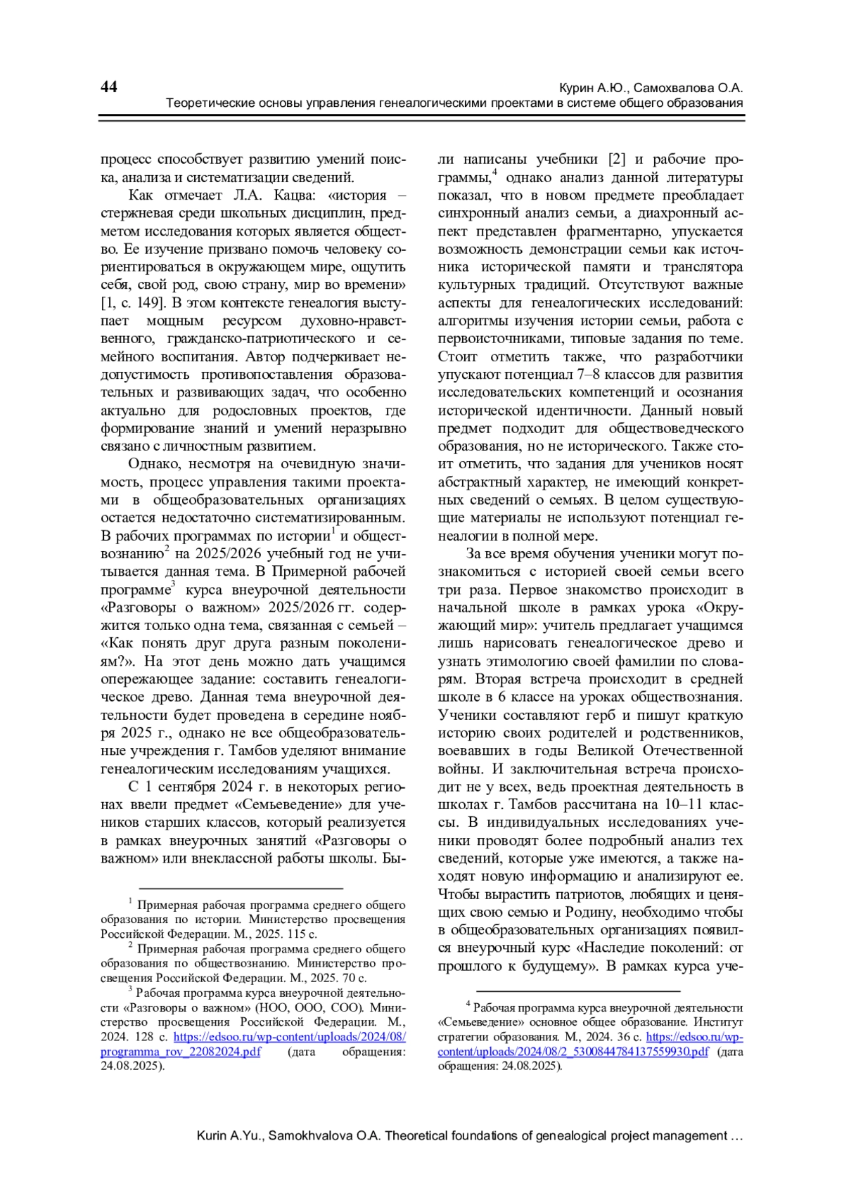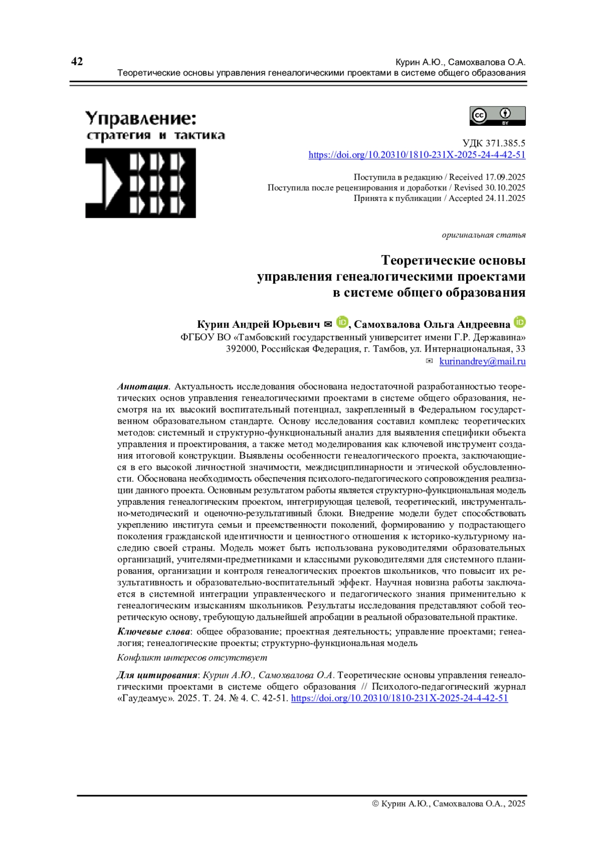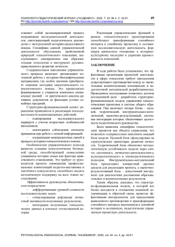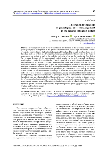 Актуальность исследования обоснована недостаточной разработанностью теоретических основ управления генеалогическими проектами в системе общего образования, несмотря на их высокий воспитательный потенциал, закрепленный в Федеральном государственном образовательном стандарте. Основу исследования составил комплекс теоретических методов: системный и структурно-функциональный анализ для выявления специфики объекта управления и проектирования, а также метод моделирования как ключевой инструмент создания итоговой конструкции. Выявлены особенности генеалогического проекта, заключающиеся в его высокой личностной значимости, междисциплинарности и этической обусловленности. Обоснована необходимость обеспечения психолого-педагогического сопровождения реализации данного проекта. Основным результатом работы является структурно-функциональная модель управления генеалогическим проектом, интегрирующая целевой, теоретический, инструментально-методический и оценочно-результативный блоки. Внедрение модели будет способствовать укреплению института семьи и преемственности поколений, формированию у подрастающего поколения гражданской идентичности и ценностного отношения к историко-культурному наследию своей страны. Модель может быть использована руководителями образовательных организаций, учителями-предметниками и классными руководителями для системного планирования, организации и контроля генеалогических проектов школьников, что повысит их результативность и образовательно-воспитательный эффект. Научная новизна работы заключается в системной интеграции управленческого и педагогического знания применительно к генеалогическим изысканиям школьников. Результаты исследования представляют собой теоретическую основу, требующую дальнейшей апробации в реальной образовательной практике.