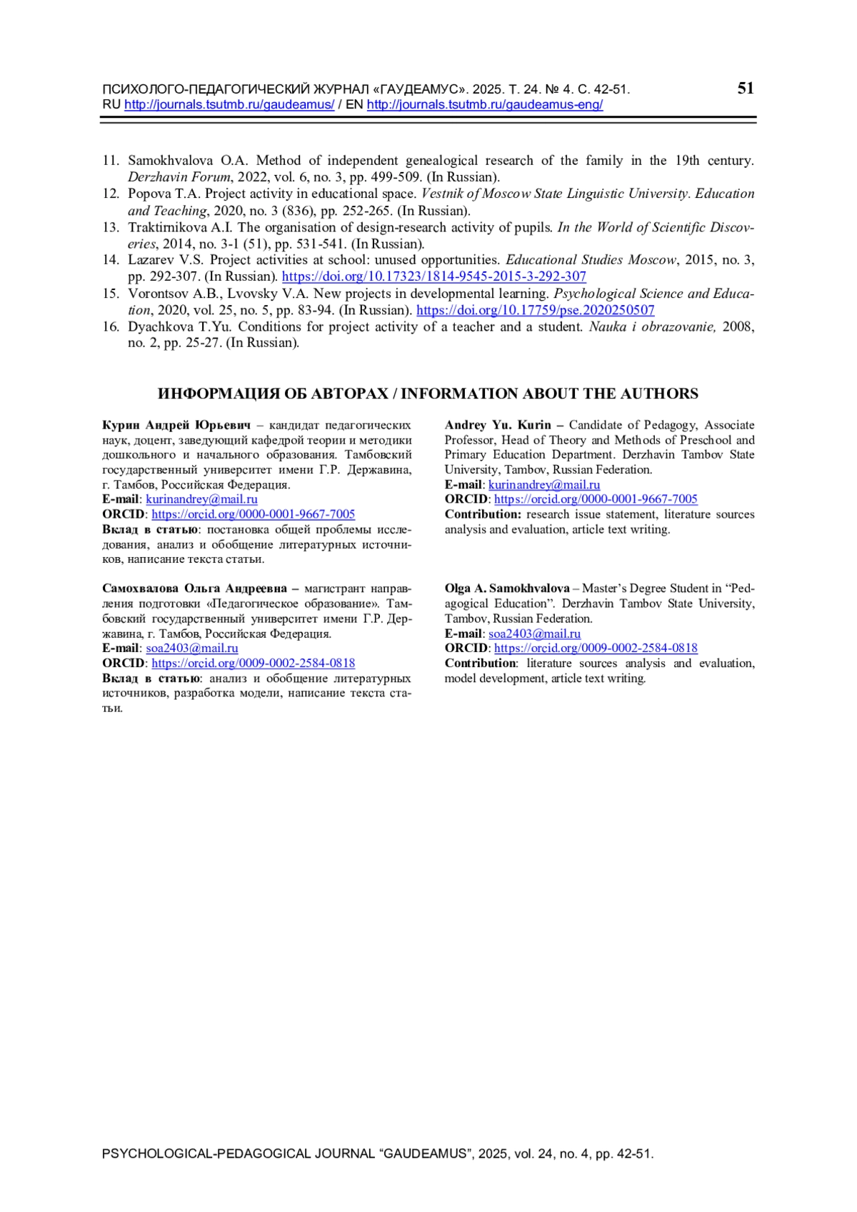 12. Попова Т.А. Проектная деятельность в образовательном пространстве // Вестник МГЛУ. Образование и педагогические науки. 2020. № 3 (836). С. 252-265.