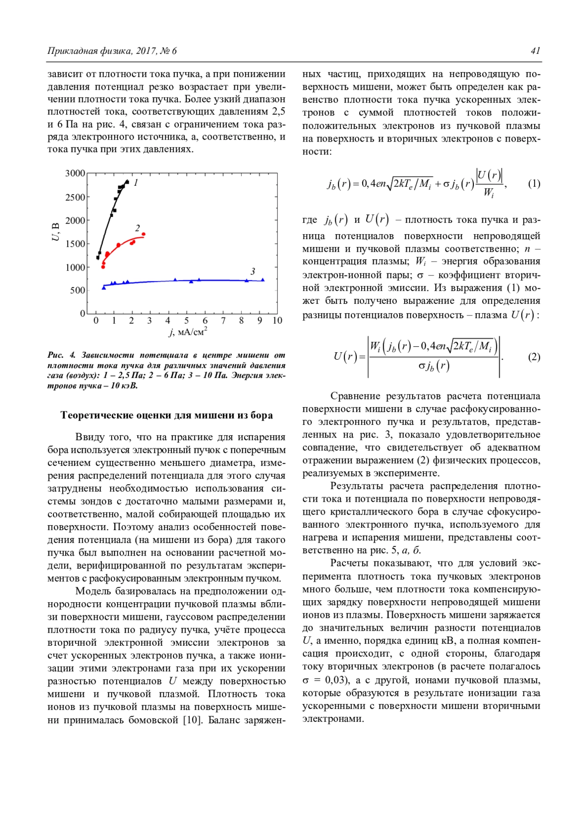 Экспериментально показано, что в области форвакуумных давлений от 2,5 до 10 Па при взаимодействии пучка электронов с поверхностью непроводящей мишени отрицательный потенциал ее поверхности, вносимый пучком, как и распределение этого потенциала, существенно зависят от энергии пучка, давления газа и плотности тока электронного пучка. Сравнение экспериментальных и полученных на основе расчетов профилей распределения потенциала на поверхности мишени показали удовлетворительное совпадения. На основании расчетов были получены распределения потенциала, соответствующие сфокусированному электронному пучку, используемому для нагрева и испарения мишени из бора при создании борсодержащих функциональных покрытий.