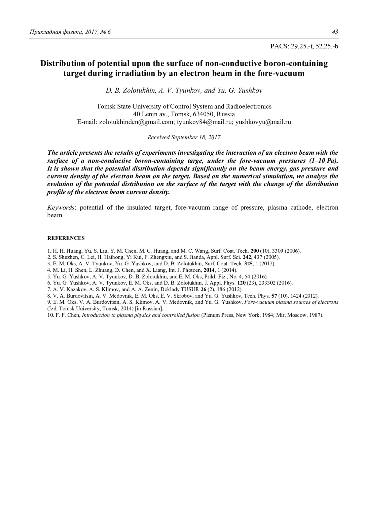 D. B. Zolotukhin, A. V. Tyunkov, and Yu. G. Yushkov Distribution of potential upon the surface of non-conductive boron-containing target during irradiation by an electron beam in the fore-vacuum 39