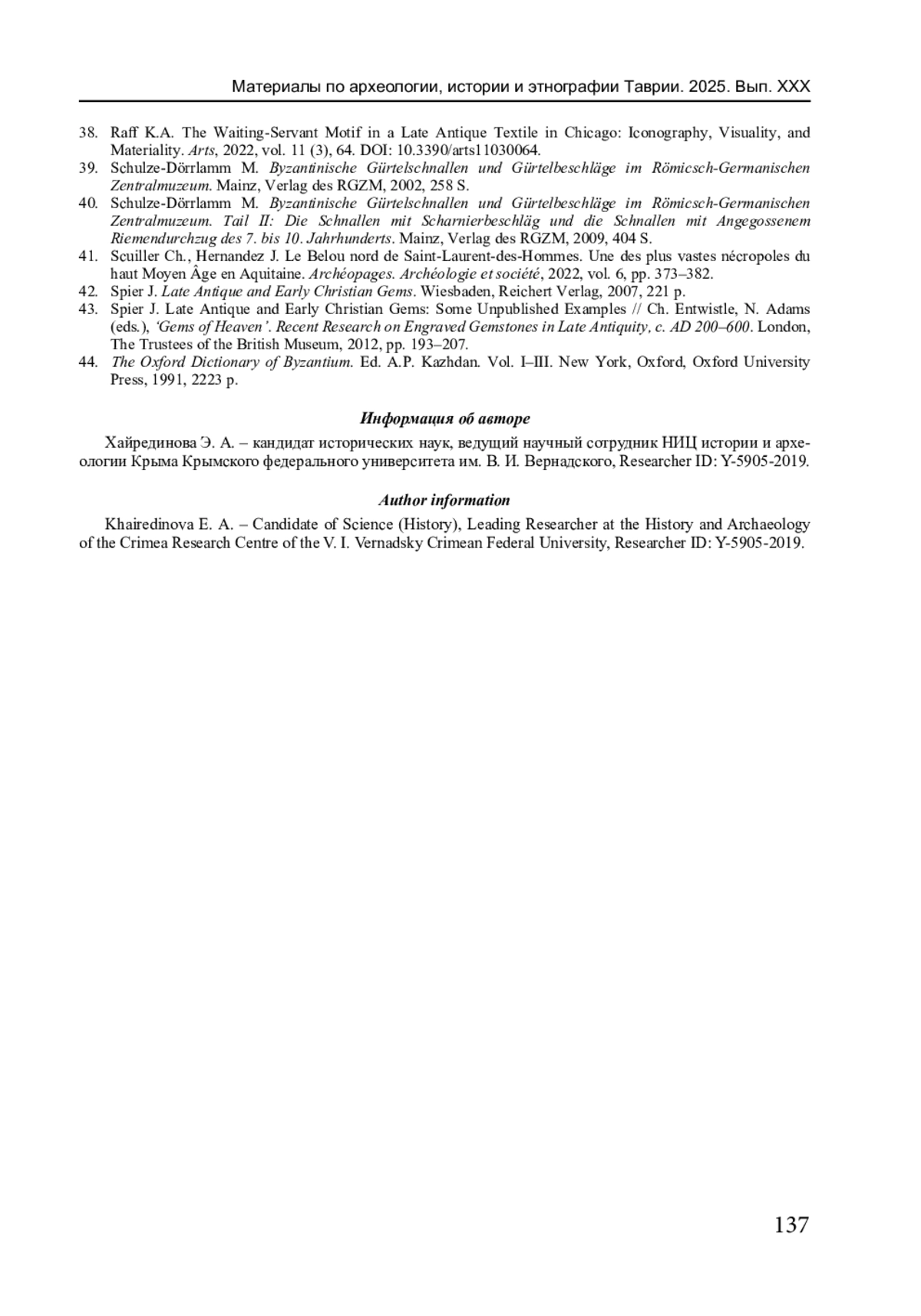 38. Raff K.A. The Waiting-Servant Motif in a Late Antique Textile in Chicago: Iconography, Visuality, and Materiality // Arts. 2022. Vol. 11 (3), 64. DOI: 10.3390/arts11030064 EDN: DRJGPO