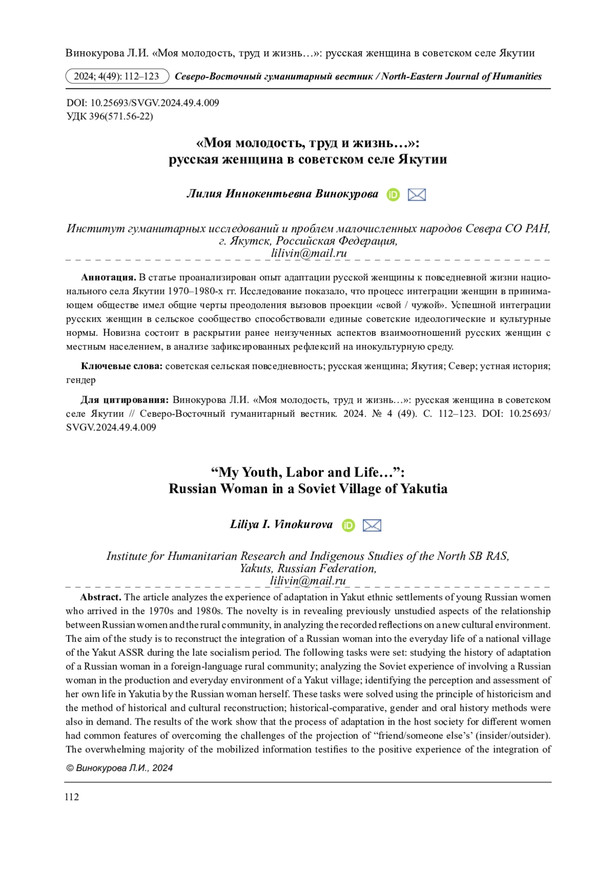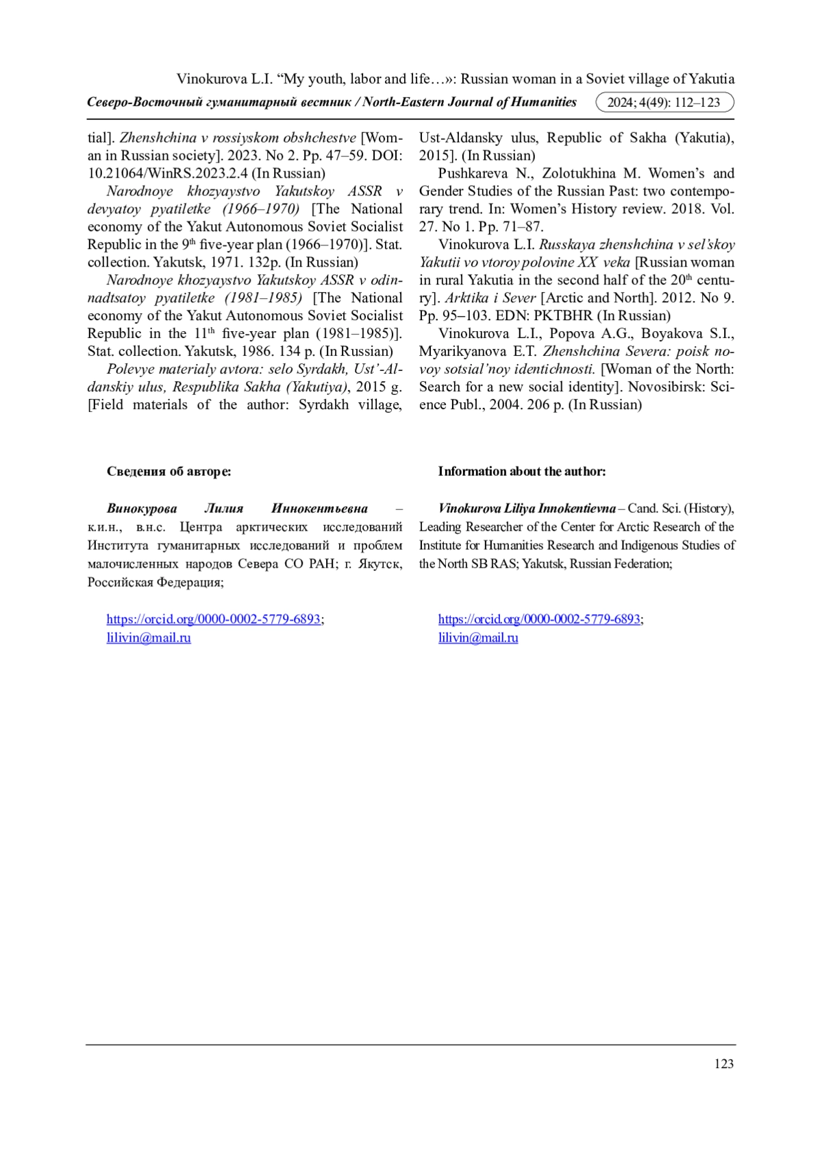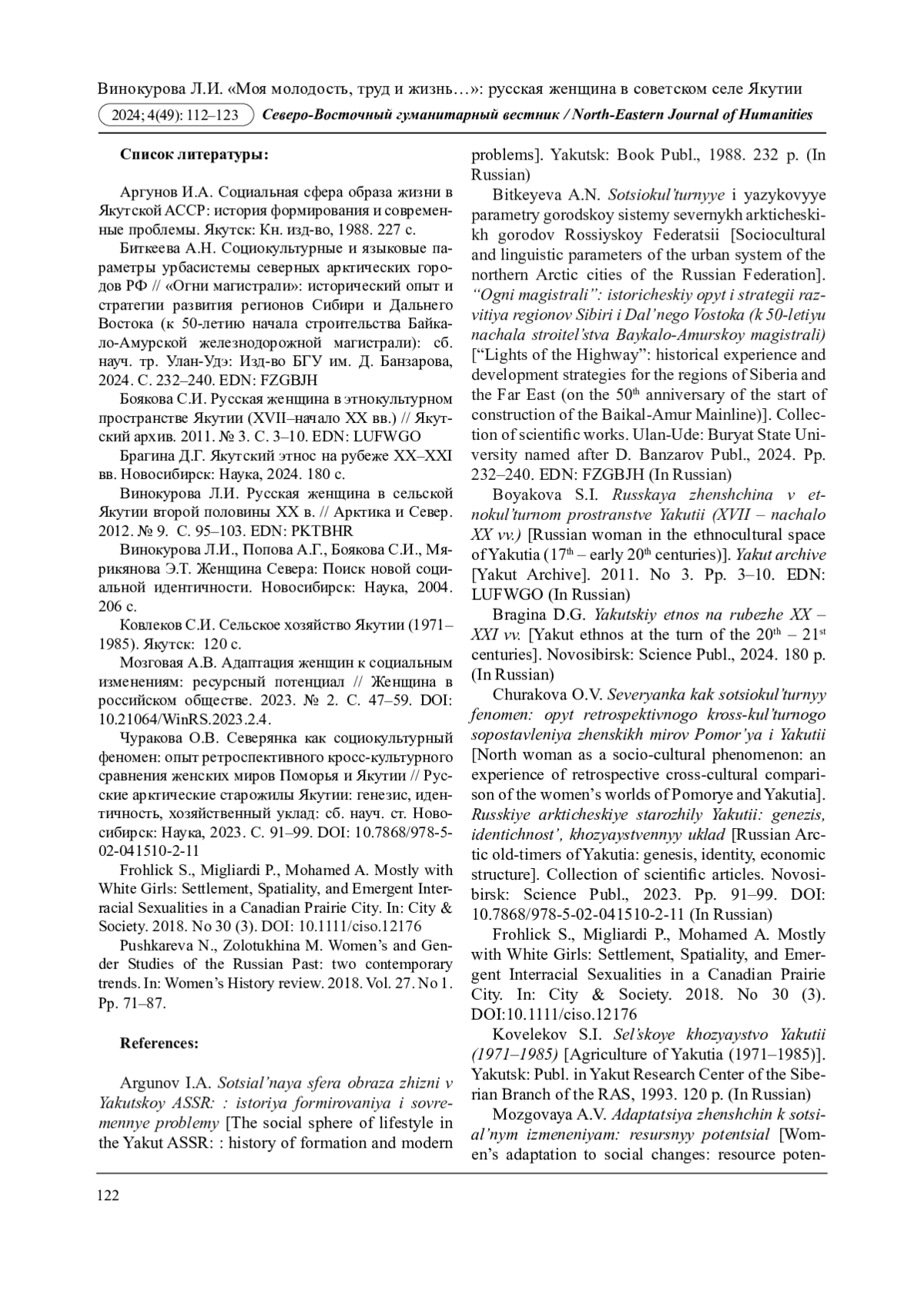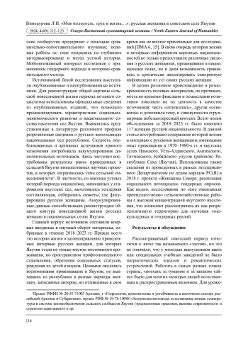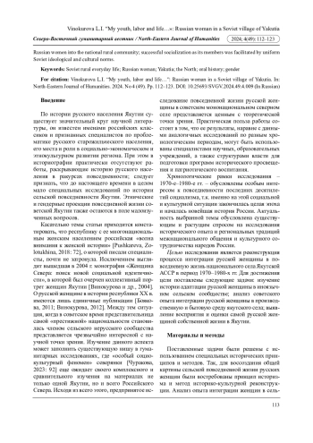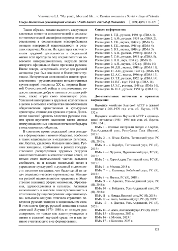 5. Винокурова Л.И. Русская женщина в сельской Якутии второй половины ХХ в. // Арктика и Север. 2012. № 9. С. 95-103. EDN: PKTBHR
