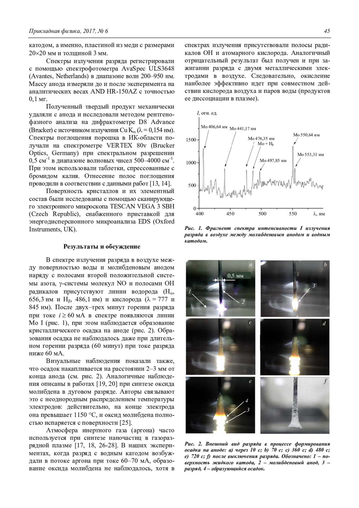 В работе показано, что при горении разряда постоянного тока в воздухе между молибденовым анодом и водным катодом происходит образование поликристаллического MoO3 в орторомбической -модификации. Его осаждение на аноде наблюдается только при токе разряда, превышающем некоторое пороговое значение. При этом осадок не накапливается при горении разряда в аргоне или в воздухе между двумя металлическими электродами. Следовательно, окисление наиболее эффективно идет при совместном действии кислорода воздуха и паров воды (продуктов ее диссоциации в плазме).