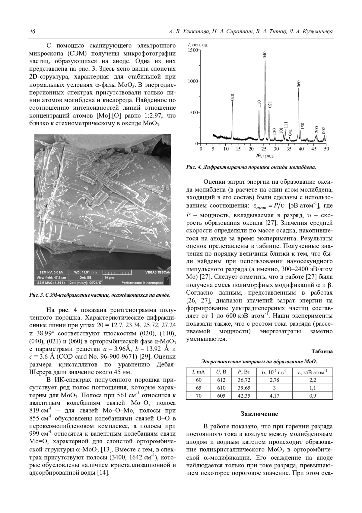 Полученный продукт изучен с использованием методов рентгеноструктурного анализа, сканирующей электронной микроскопии, энергодисперсионного микроанализа и инфракрасной спектроскопии. Затраты энергии на синтез оксида уменьшаются с ростом тока разряда и составляют около 1 кэВ на атом молибдена при мощности разряда 40 Вт.