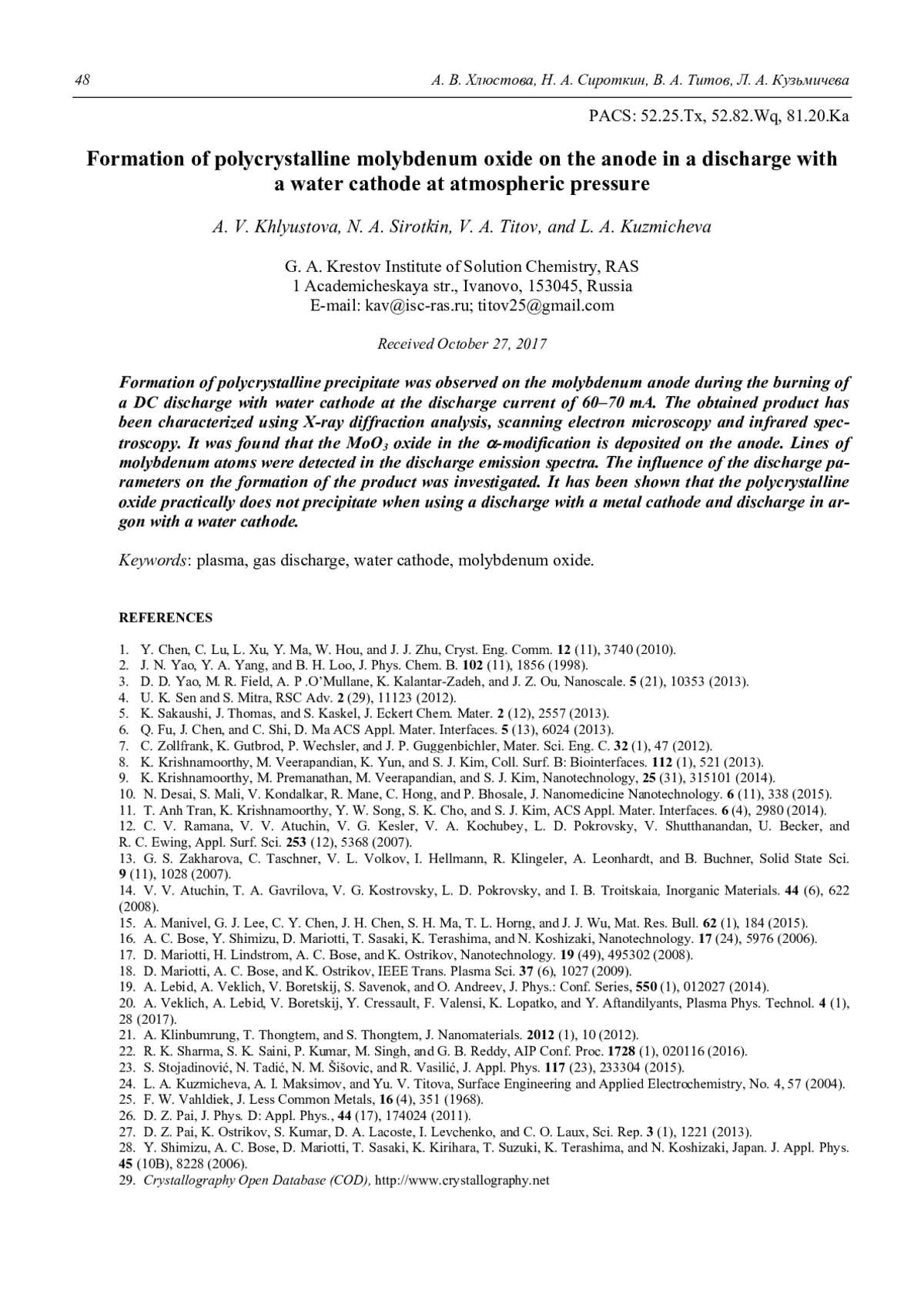 A. V. Khlyustova, N. A. Sirotkin, V. A. Titov, and L. A. Kuzmicheva Formation of polycrystalline molybdenum oxide on the anode in a discharge with a water cathode at atmospheric pressure 44