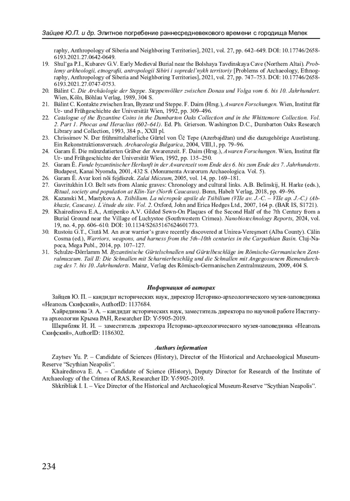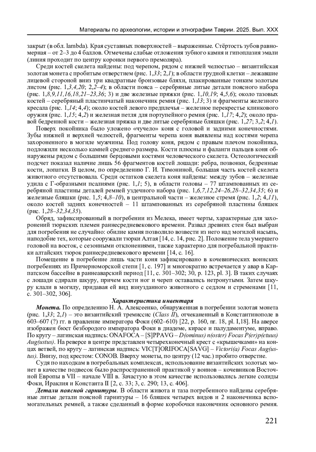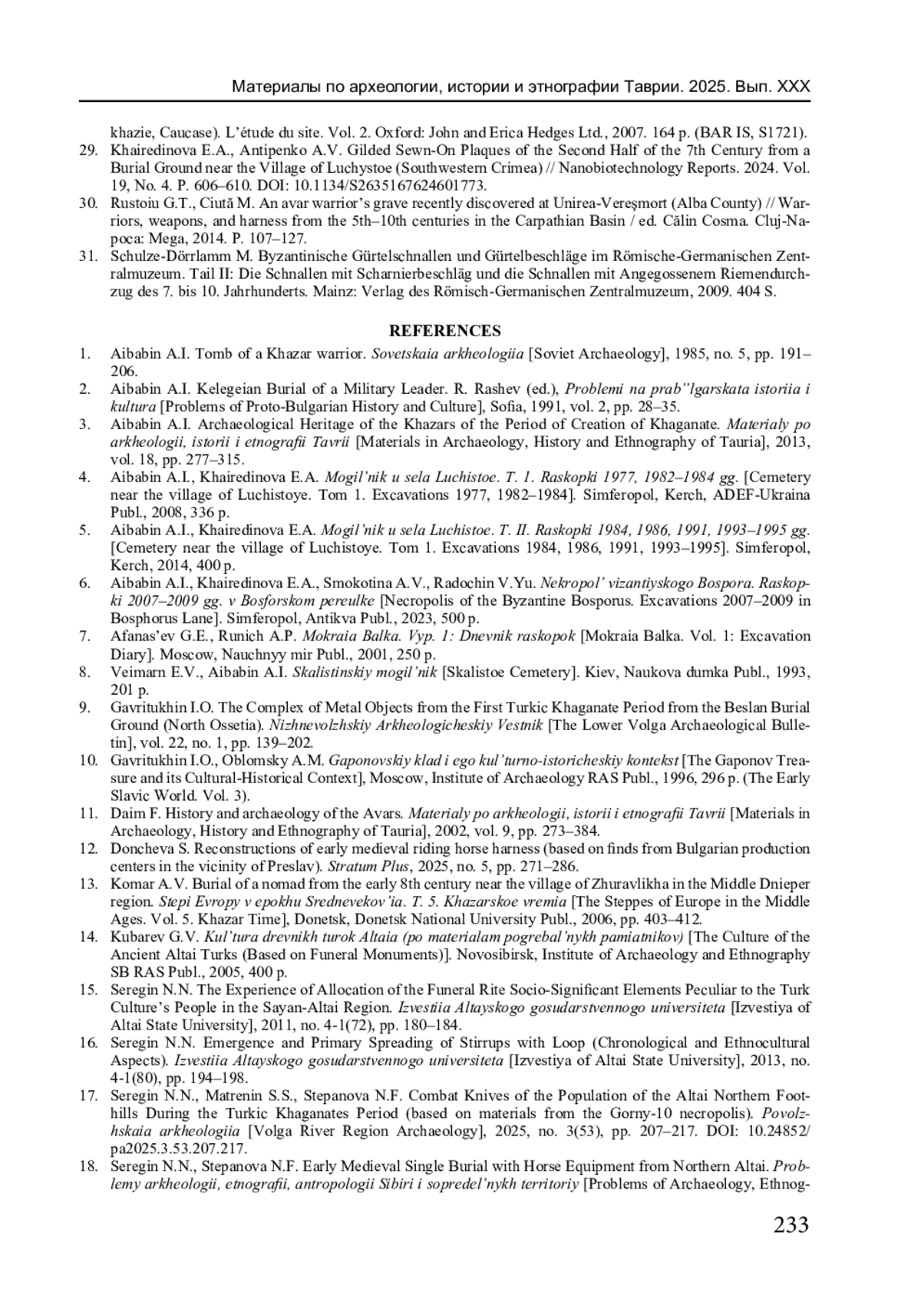 29. Khairedinova E.A., Antipenko A.V. Gilded Sewn-On Plaques of the Second Half of the 7th Century from a Burial Ground near the Village of Luchystоe (Southwestern Crimea) // Nanobiotechnology Reports. 2024. Vol. 19, No. 4. P. 606-610. DOI: 10.1134/S2635167624601773 EDN: WDSFGC