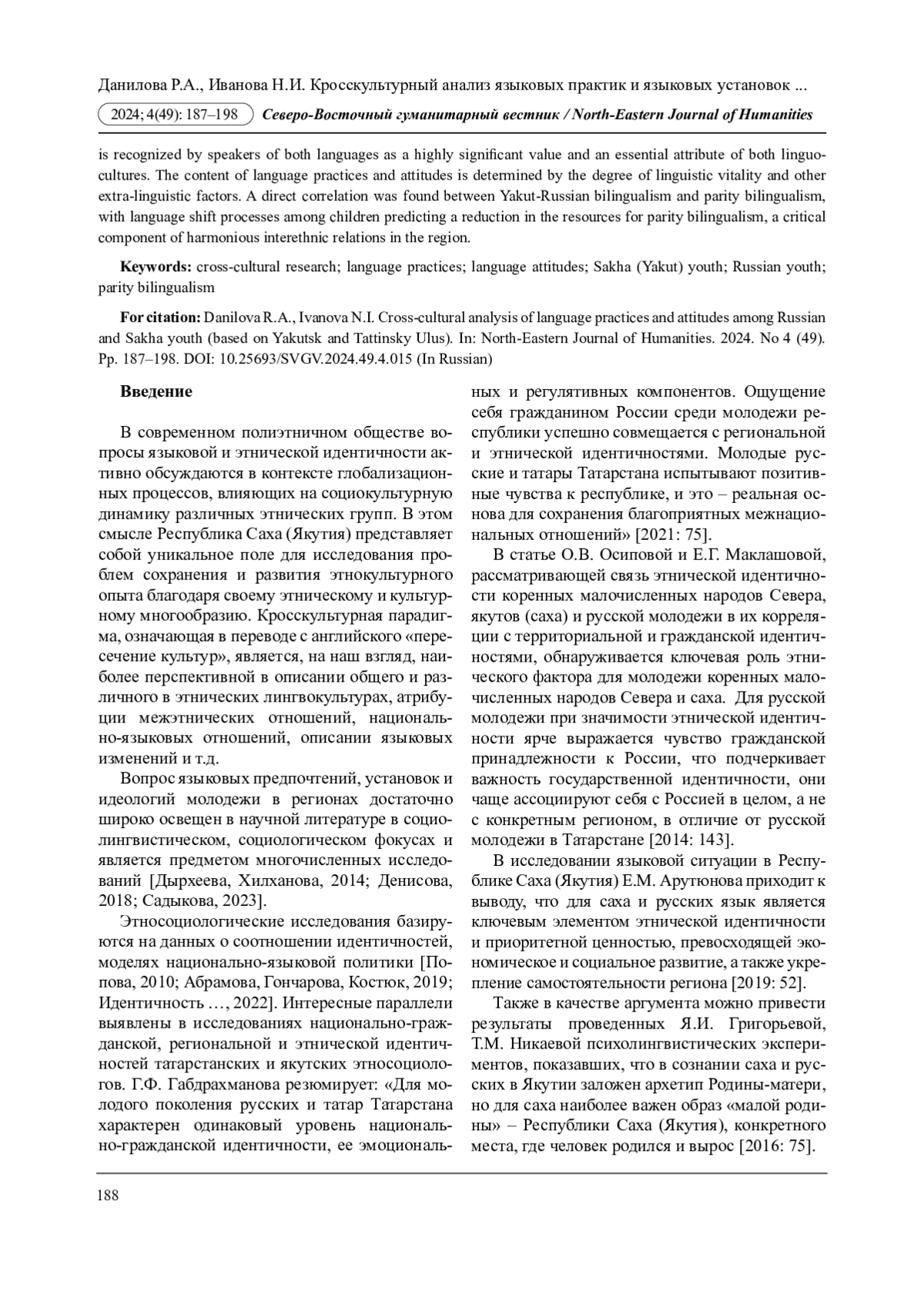5. Иванова Н.И. Речевое поведение в условиях межкультурной коммуникации: социолингвистическая реальность Якутии // Известия Российского государственного педагогического университета им. А.И. Герцена. 2008. № 88. С. 132-140. EDN: JVVHQZ