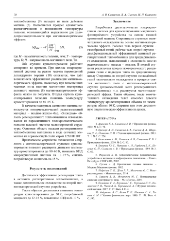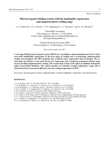 Самвелов А. В., Сысоев Д. А., Оганесян Н. Н., Баранов И. В., Баранов А. Ю. Микрокриогенная система Стирлинга с лантаноидным регенератором и магнитокалорической ступенью охлаждения 68