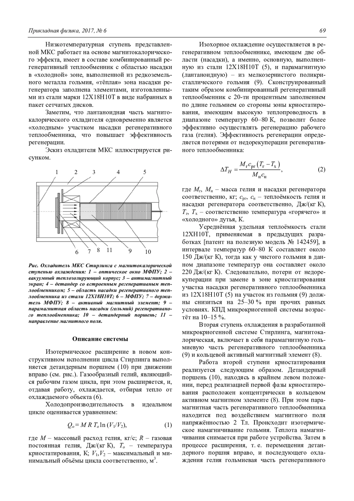 Разработана двухступенчатая микрокриогенная система для криостатирования матричного фотоприёмного устройства на основе газовой криогенной машины Стирлинга со ступенью окончательного охлаждения на основе магнитокалорического эффекта. Рабочее тело первой ступени – газообразный гелий, рабочее тело второй ступени – двухфункциональный эффективный активный регенеративный теплообменник для предварительного охлаждения, выполненный в «холодной» зоне из редкоземельного металла – гольмия. В первой ступени реализуется процесс изотермического расширения гелия с подводом тепла по традиционному циклу Стирлинга, во второй ступени охлаждённый гелий окончательно охлаждается в процессе снятия магнитного поля с магнитокалорической ступени (редкоземельной части регенеративного теплообменника), т. е. реализуется магнитокалорический эффект. Таким образом, после окончательного охлаждения гелий способен довести температуру криостатирования объекта до температуры вблизи 60 К, сохраняя при этом достаточную энергетическую эффективность цикла.
