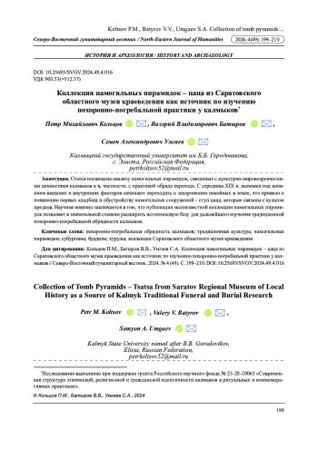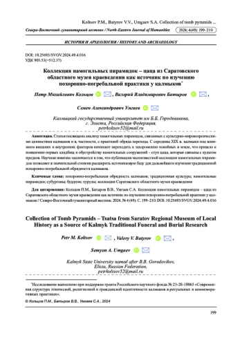 Статья посвящена анализу намогильных пирамидок, связанных с культурно-мировозренческими ценностями калмыков и в, частности, с практикой обряда перехода. С середины XIX в. калмыки под влиянием внешних и внутренних факторов начинают переходить к захоронению покойных в земле, что привело к появлению первых кладбищ и обустройству намогильных сооружений - ступ цаца, которые связаны с культом предков. Научная новизна заключается в том, что публикация малоизвестной коллекции намогильных пирамидок позволяет в значительной степени расширить источниковую базу для дальнейшего изучения традиционной похоронно-погребальной обрядности калмыков.