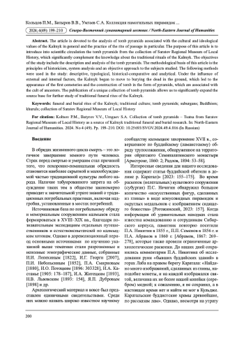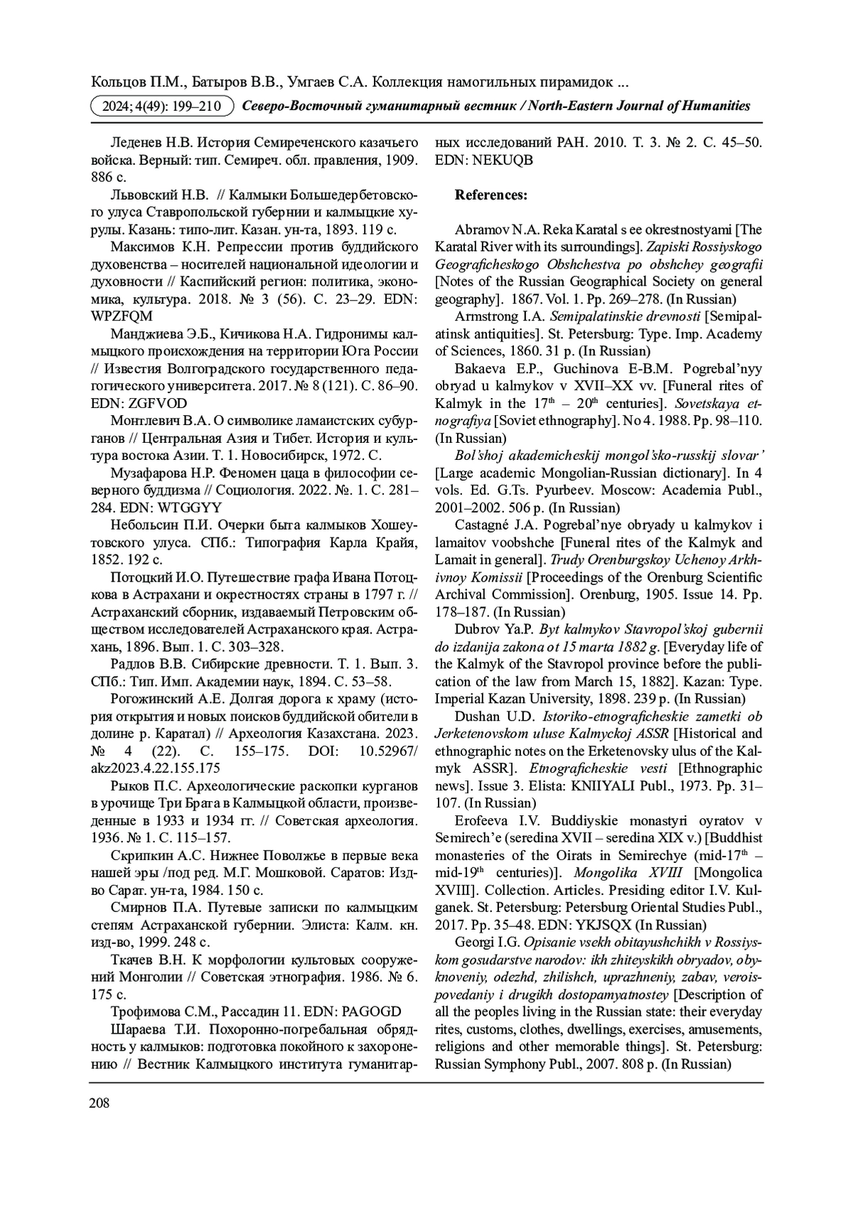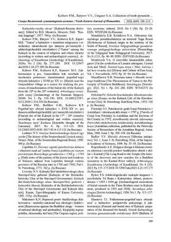10. Кольцов П.М., Кольцова К.П., Касенов М.С. Захоронения у пос. Ганюшкино как источник по изучению процессов трансформации погребального обряда калмыков с XVIII по XX вв. // Археология евразийских степей. 2024б. № 1. С. 318-330. DOI: 10.24852/2587-6112.2024.1.318.330 EDN: UYFGUV
