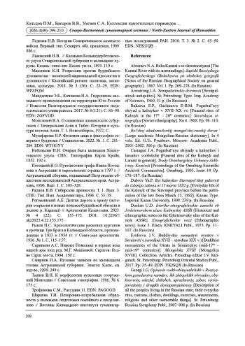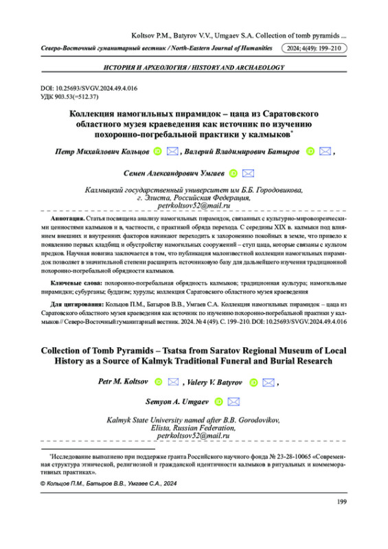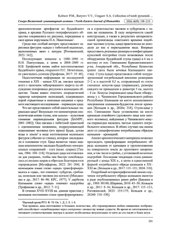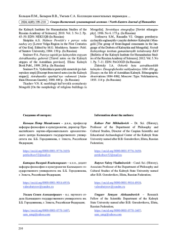 9. Кольцов П.М., Батыров В.В., Кольцова К.П., Кипиев М.К. “Цаца” у калмыков в контексте религиозной и этнической идентичности (по данным письменных и археологических источников) // Археология Казахстана. 2024а. № 2 (24) С. 277-289. DOI: 10.52967/akz2024.2.24.277.289 EDN: FGTJMG