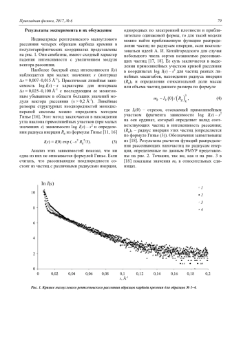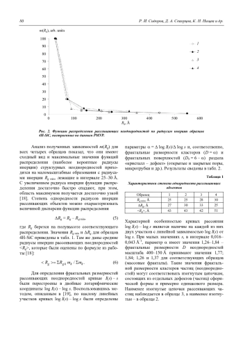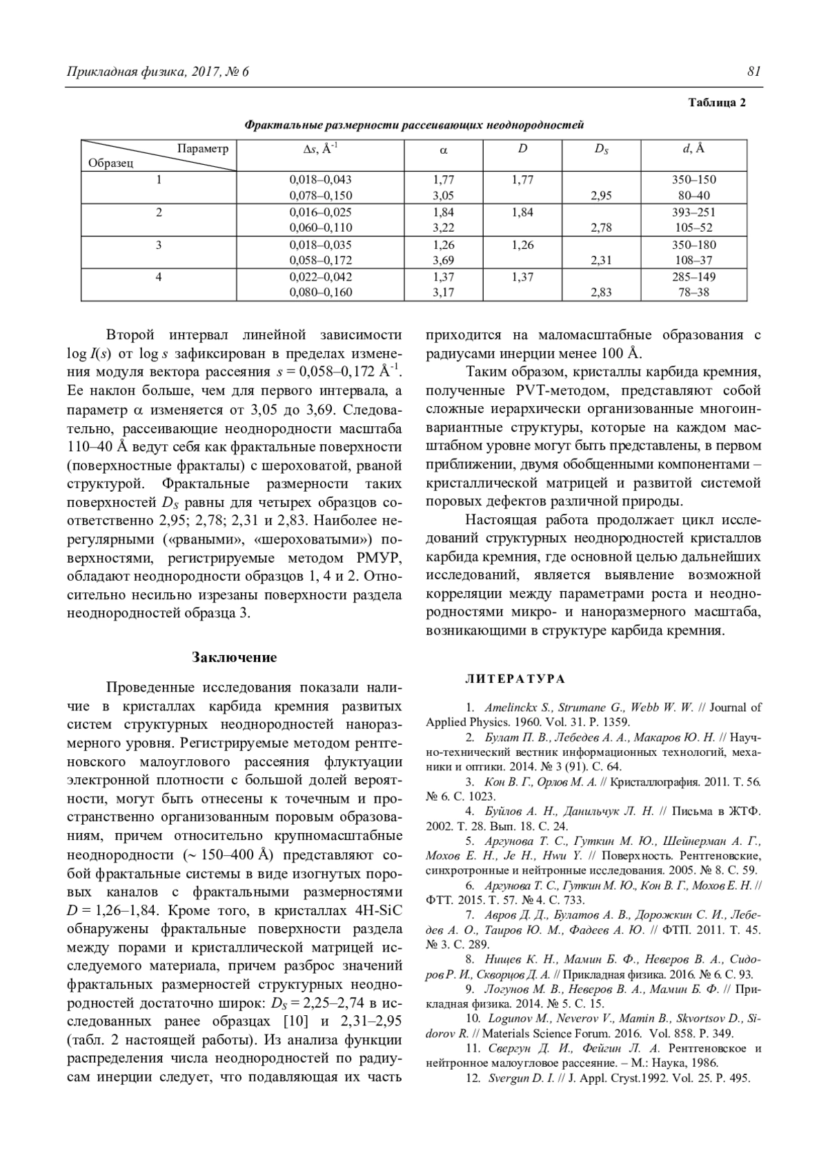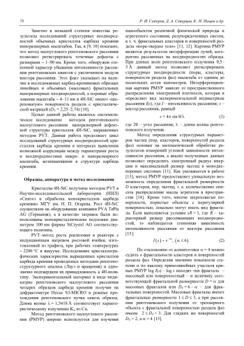 Проведенные исследования показали наличие в кристаллах карбида кремния развитых систем структурных неоднородностей наноразмерного уровня. Регистрируемые методом рентгеновского малоуглового рассеяния флуктуации электронной плотности с большой долей вероятности, могут быть отнесены к точечным и пространственно организованным поровым образованиям, причем относительно крупномасштабные неоднородности ( 150–400 Å) представляют собой фрактальные системы в виде изогнутых поровых каналов с фрактальными размерностями D = 1,26–1,84. Кроме того, в кристаллах 4H-SiC обнаружены фрактальные поверхности раздела между порами и кристаллической матрицей исследуемого материала, причем разброс значений фрактальных размерностей структурных неоднородностей достаточно широк: DS = 2,25–2,74 в исследованных ранее образцах [10] и 2,31–2,95 (табл. 2 настоящей работы). Из анализа функции распределения числа неоднородностей по радиусам инерции следует, что подавляющая их часть приходится на маломасштабные образования с радиусами инерции менее 100 Å.