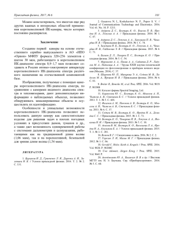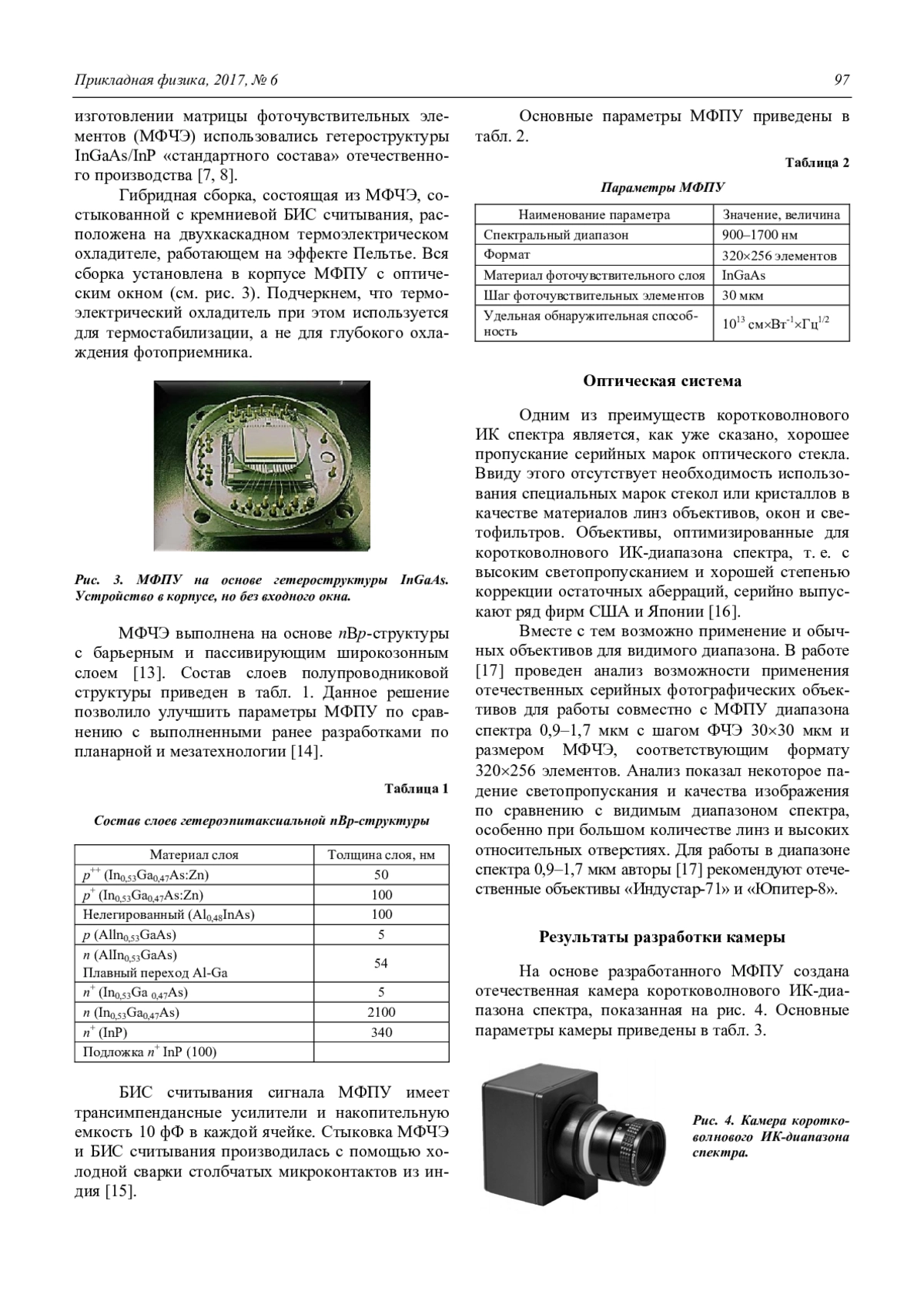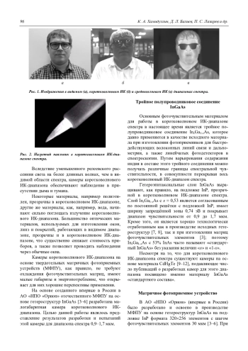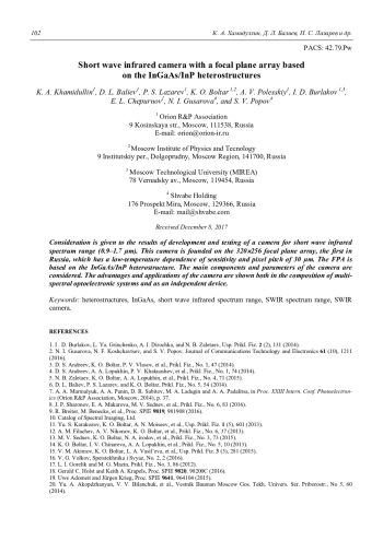 Хамидуллин К. А., Балиев Д. Л., Лазарев П. С., Болтарь К. О., Полесский А. В., Бурлаков И. Д., Чепурнов Е. Л., Гусарова Н. И., Попов С. В. Камера коротковолнового инфракрасного диапазона спектра с матричным фотоприемным устройством на основе гетероструктур InGaAs/InP 95