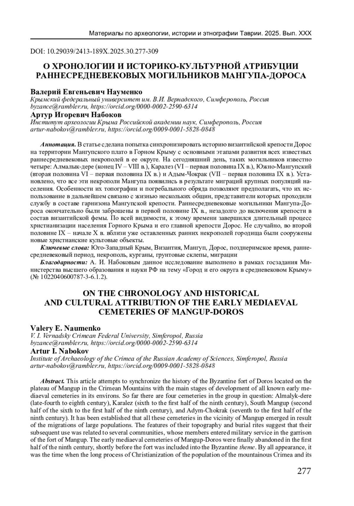 24. Набоков А.И. Раннесредневековые могильники южной периферии Мангупского городища: основные результаты современных археолого-топографических исследований // История и археология Крыма. 2023. Вып. ХX. С. 182-203. EDN: OBOWBW