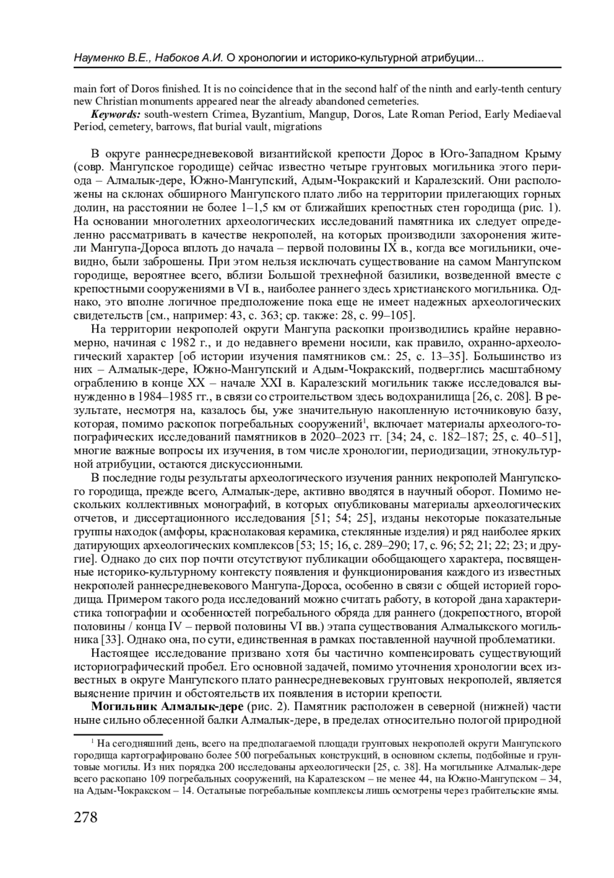 34. Науменко В.Е., Набоков А.И. Могильник Алмалык-дере Мангупского городища. Основные результаты археолого-топографических исследований 2020-2021 гг. // Актуальные вопросы охраны и использования культурного наследия Крыма: материалы VIII Всероссийской научно-практической конференции / ред.-сост. В.Е. Науменко. Симферополь: Ариал, 2022. С. 102-117. EDN: YWSHGK