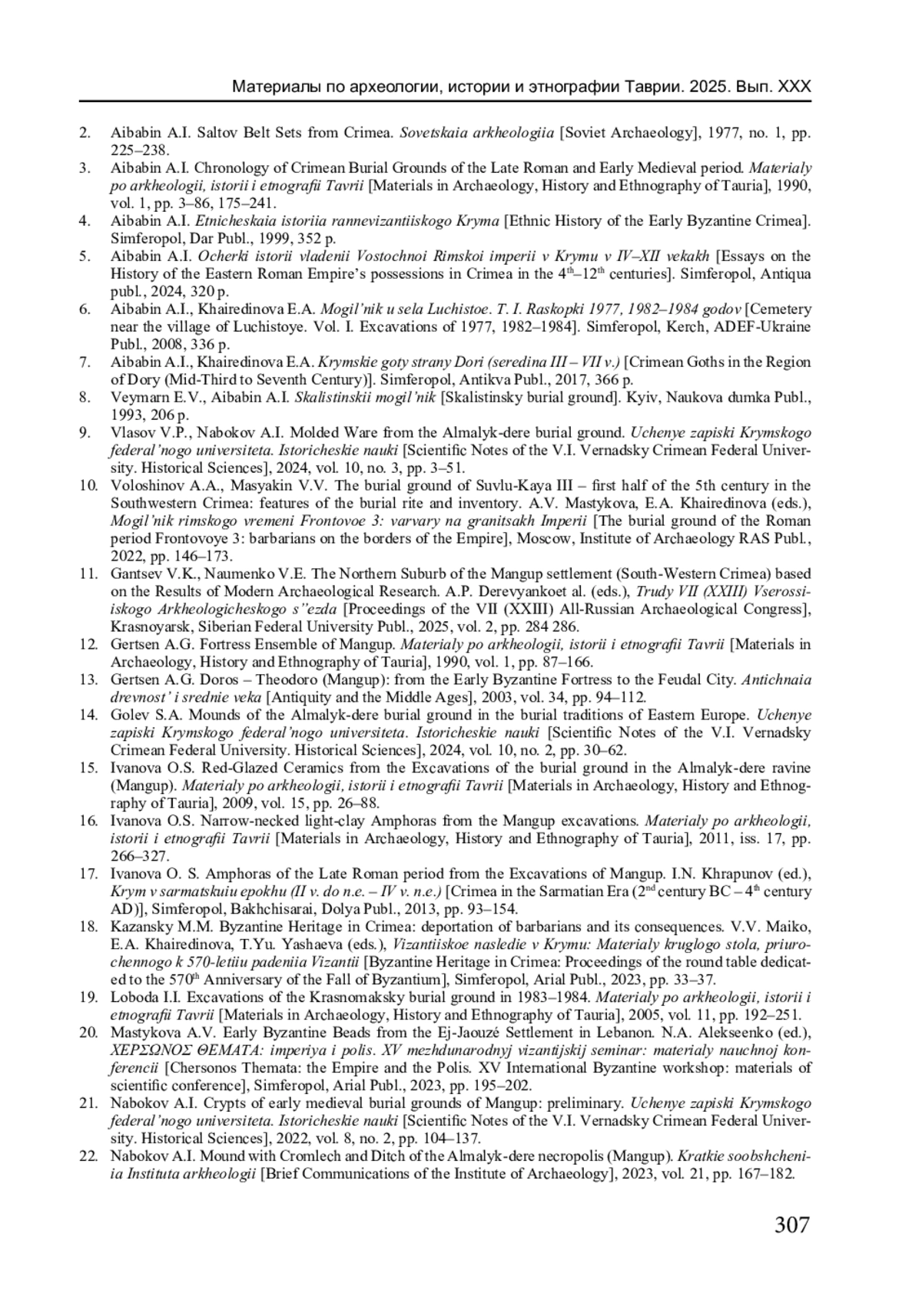 26. Набоков А.И. Малоизвестный могильник раннесредневекового времени на пересечении балок Каралез и Джан-дере в округе Мангупского городища // ΧΕΡΣΩΝΟΣ ΘΕΜΑΤΑ: империя и полис. ХVII Международный византийский семинар: материалы научной конференции / отв. ред. Н.А. Алексеенко. Симферополь: Ариал, 2025. С. 207-216. EDN: IQQMFK