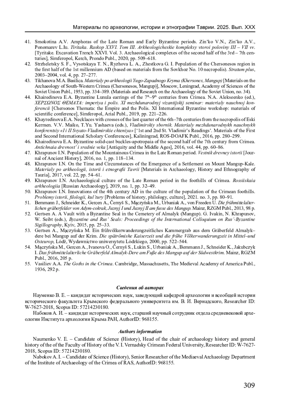 32. Науменко В.Е., Герцен А.Г., Иожица Д.В. Христианский Мангуп. Современная источниковая база и основные этапы истории // Материалы по археологии, истории и этнографии Таврии. 2021. Вып. XXVI. С. 255-281. EDN: TQSNDE