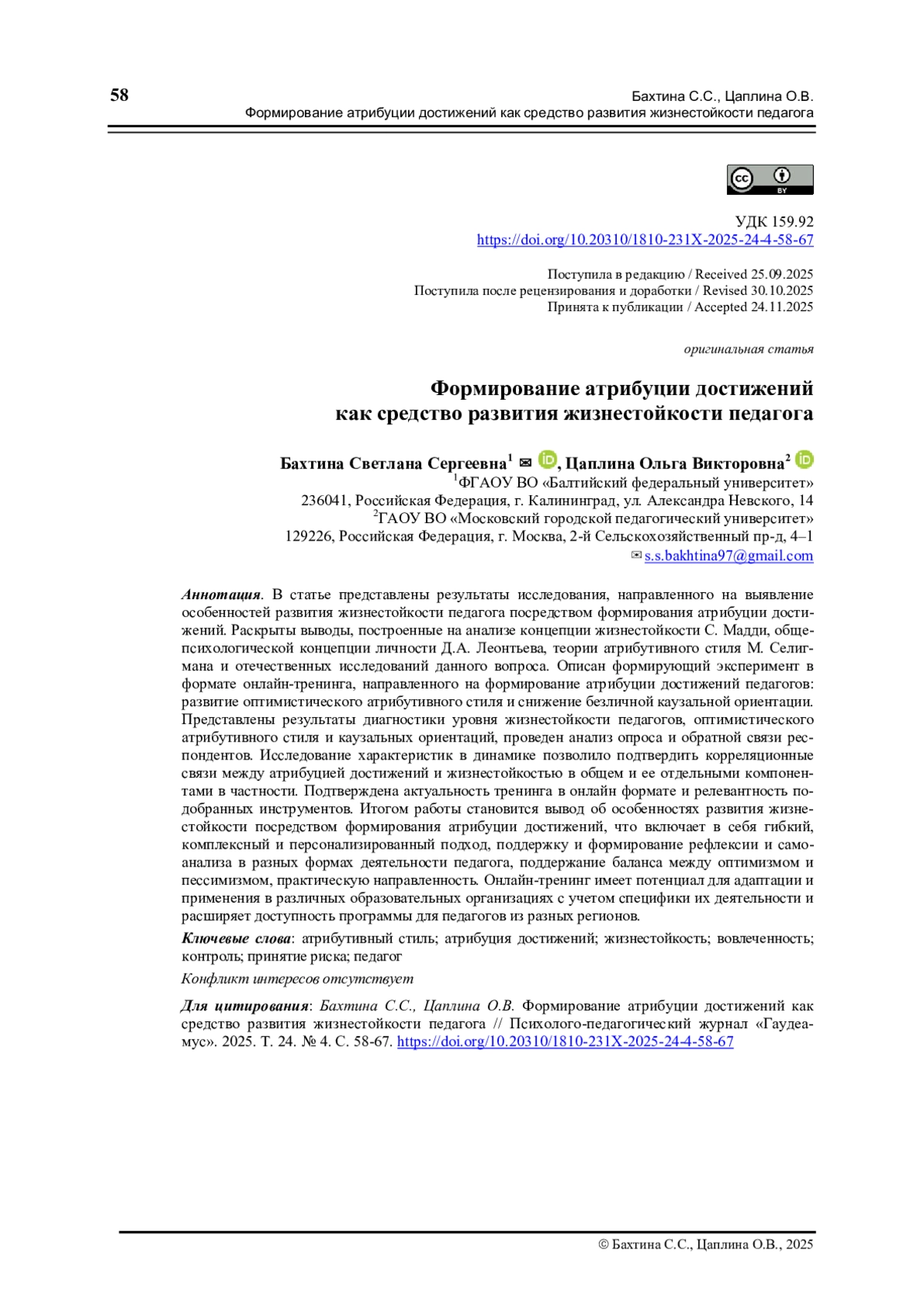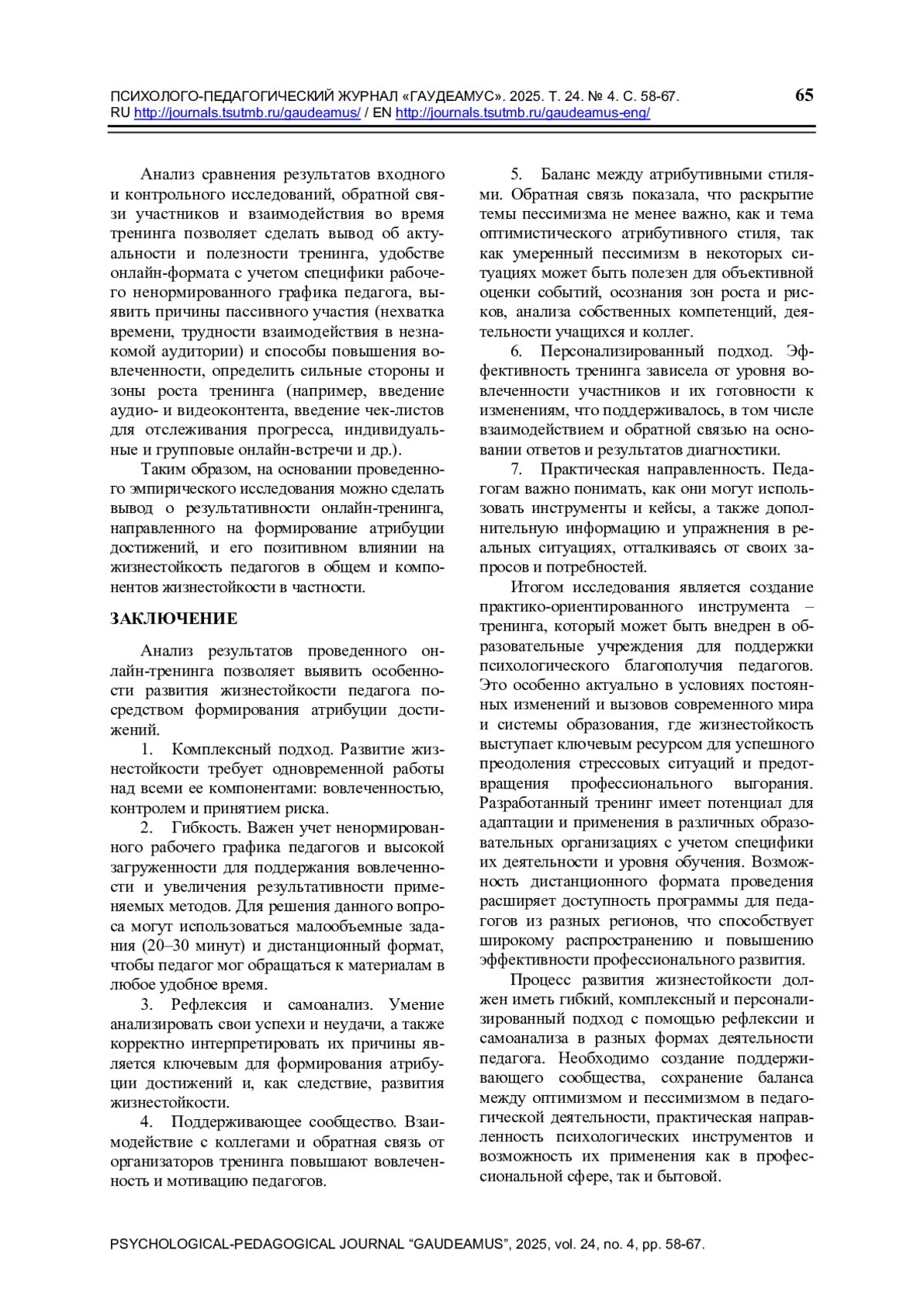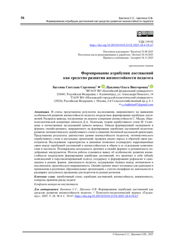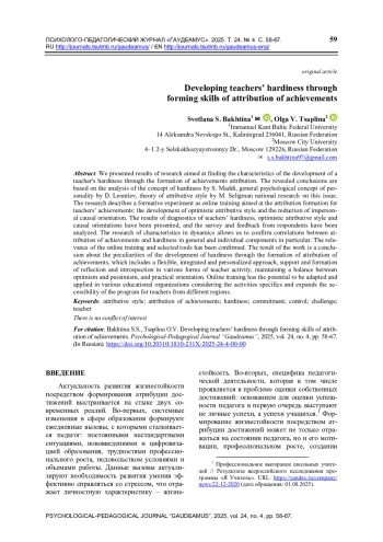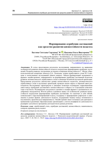 В статье представлены результаты исследования, направленного на выявление особенностей развития жизнестойкости педагога посредством формирования атрибуции достижений. Раскрыты выводы, построенные на анализе концепции жизнестойкости С. Мадди, общепсихологической концепции личности Д. А. Леонтьева, теории атрибутивного стиля М. Селигмана и отечественных исследований данного вопроса. Описан формирующий эксперимент в формате онлайн-тренинга, направленного на формирование атрибуции достижений педагогов: развитие оптимистического атрибутивного стиля и снижение безличной каузальной ориентации. Представлены результаты диагностики уровня жизнестойкости педагогов, оптимистического атрибутивного стиля и каузальных ориентаций, проведен анализ опроса и обратной связи респондентов. Исследование характеристик в динамике позволило подтвердить корреляционные связи между атрибуцией достижений и жизнестойкостью в общем и ее отдельными компонентами в частности. Подтверждена актуальность тренинга в онлайн формате и релевантность подобранных инструментов. Итогом работы становится вывод об особенностях развития жизнестойкости посредством формирования атрибуции достижений, что включает в себя гибкий, комплексный и персонализированный подход, поддержку и формирование рефлексии и самоанализа в разных формах деятельности педагога, поддержание баланса между оптимизмом и пессимизмом, практическую направленность. Онлайн-тренинг имеет потенциал для адаптации и применения в различных образовательных организациях с учетом специфики их деятельности и расширяет доступность программы для педагогов из разных регионов.