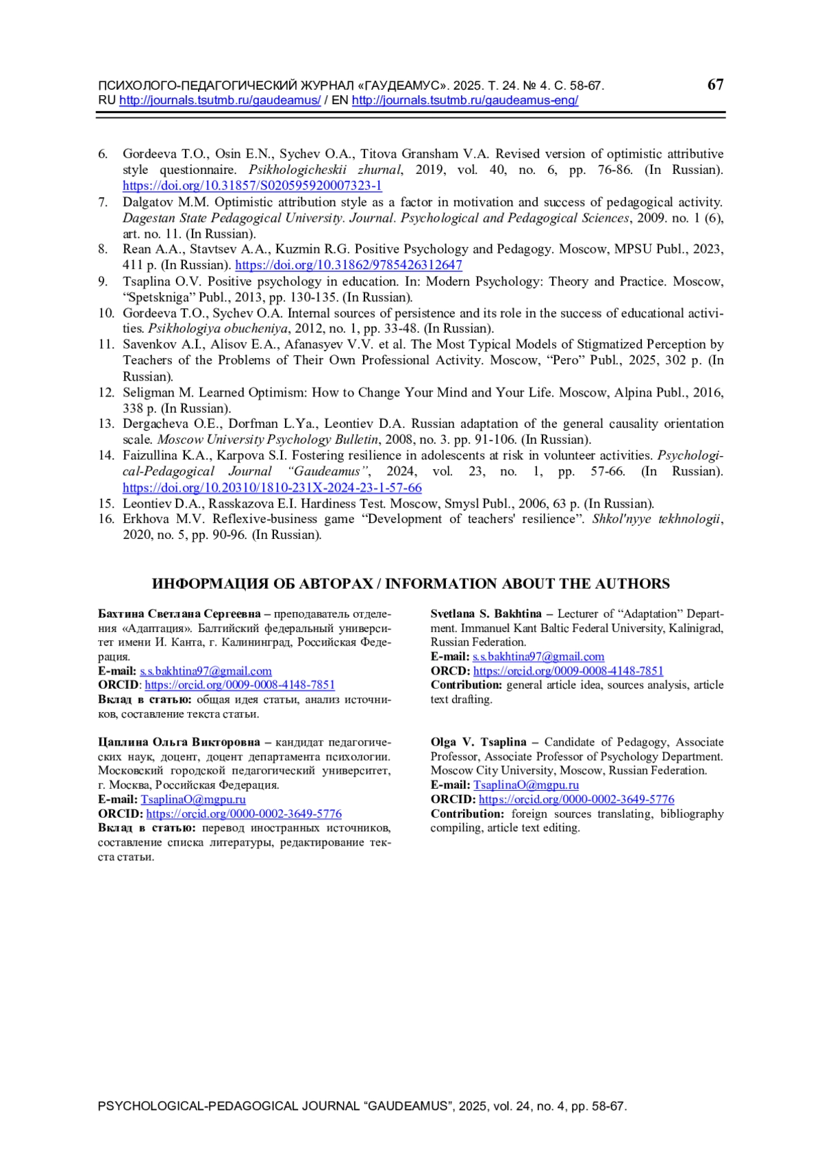 6. Гордеева Т.О., Осин Е.Н., Сычев О.А., Титова Граншам В.А. Краткий опросник оптимистического атрибутивного стиля // Психологический журнал. 2019. T. 40. № 6. C. 76-86. ,. DOI: 10.31857/S020595920007323-1