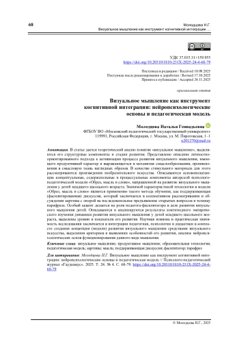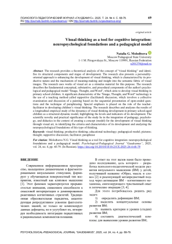 В статье дается теоретический анализ понятия «визуальное мышление», выделяются его структурные компоненты и стадии развития. Представлено описание личностноориентированного подхода к активизации процесса развития визуального мышления, имеющего продуктивный характер и выражающегося в механизме смыслообразования, проникновения в смысловую ткань наглядных образов. В качестве стимульного материала для этого рассматриваются произведения изобразительного искусства. Описываются основополагающие концептуальные, содержательные и процессуальные компоненты авторской психологопедагогической модели «Образ, мысль и слово», направленной на развитие визуального мышления у детей младшего школьного возраста. Значимой характеристикой технологии в модели «Образ, мысль и слово» является применение такого метода обучения, как поддерживающая (фасилитированная) дискуссия, который заключается в коллективном рассматривании и обсуждении картины с опорой на последовательное предъявление открытых вопросов и технику парафраза. Особый акцент делается на роли педагога-фасилитатора в деле развития визуального мышления детей. Описываются и анализируются результаты лонгитюдного эмпирического изучения динамики развития визуального мышления у детей младшего школьного возраста, выделены уровни и показатели его развития. Научная новизна и практическая значимость исследования заключается в интеграции педагогики, психологии и дидактики в контексте создания концепции (модели) развития визуального мышления средствами визуального искусства, выделении критериев и выявлении особенностей его развития, анализе нейропсихологических основ функционирования данного вида мышления.