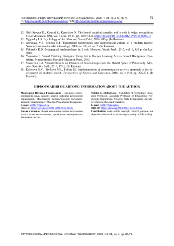 10. Полякова Е.В. Применение способов и методов визуального мышления в современном образовании // Известия ЮФУ. Технические науки. 2012. № 10 (135). С. 120-124.