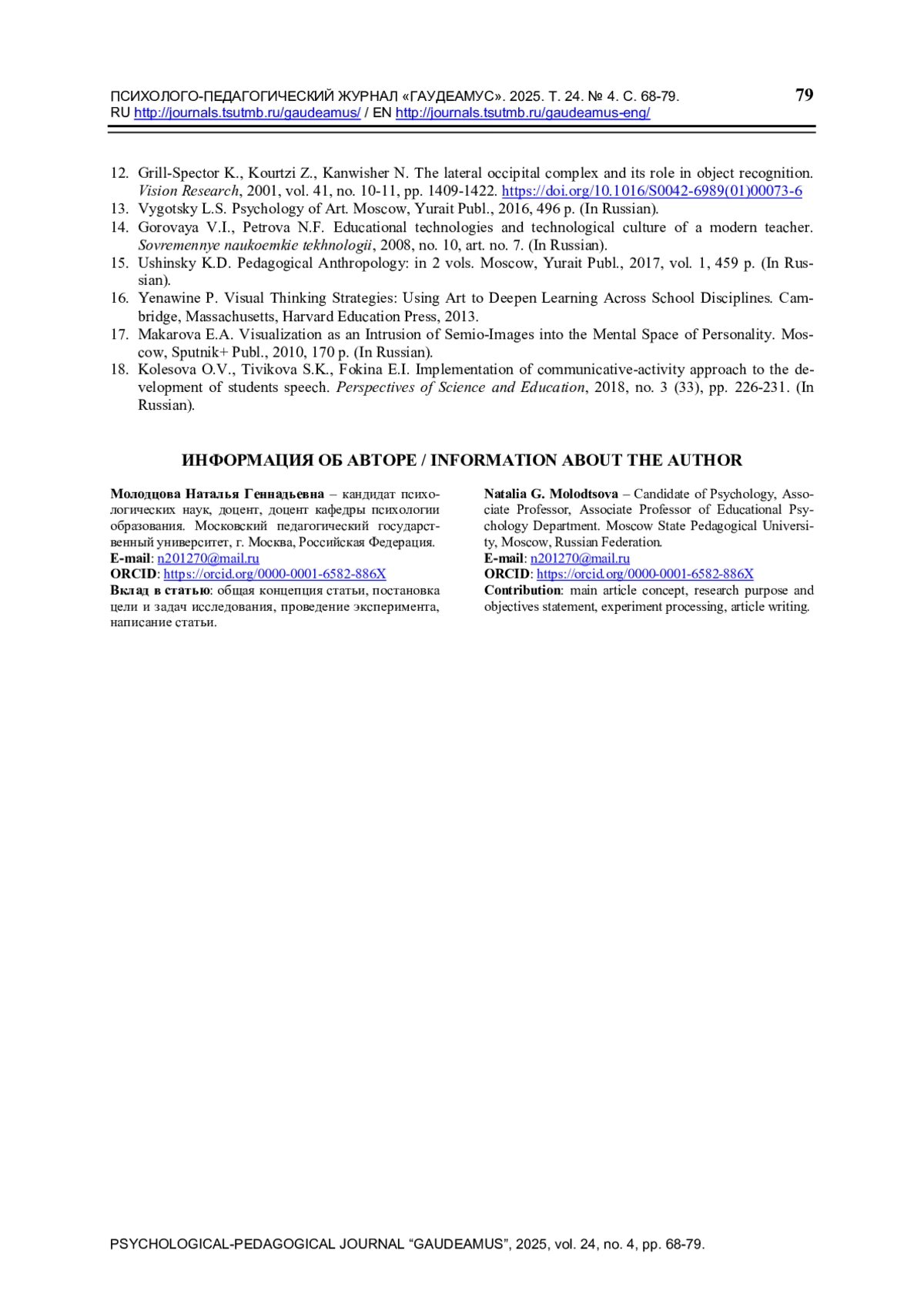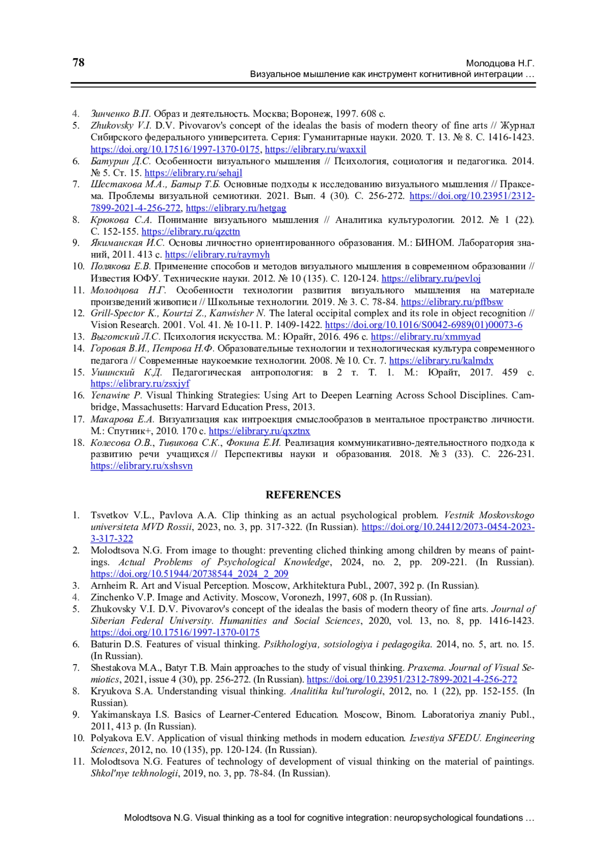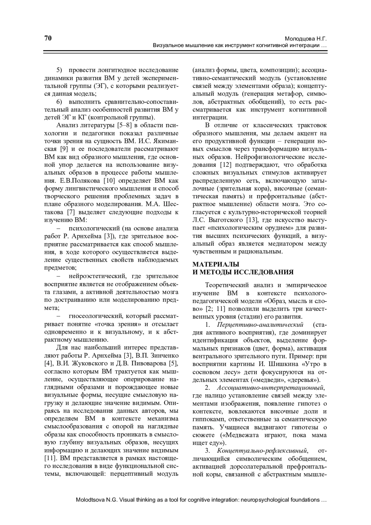 11. Молодцова Н.Г. Особенности технологии развития визуального мышления на материале произведений живописи // Школьные технологии. 2019. № 3. С. 78-84.