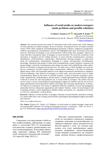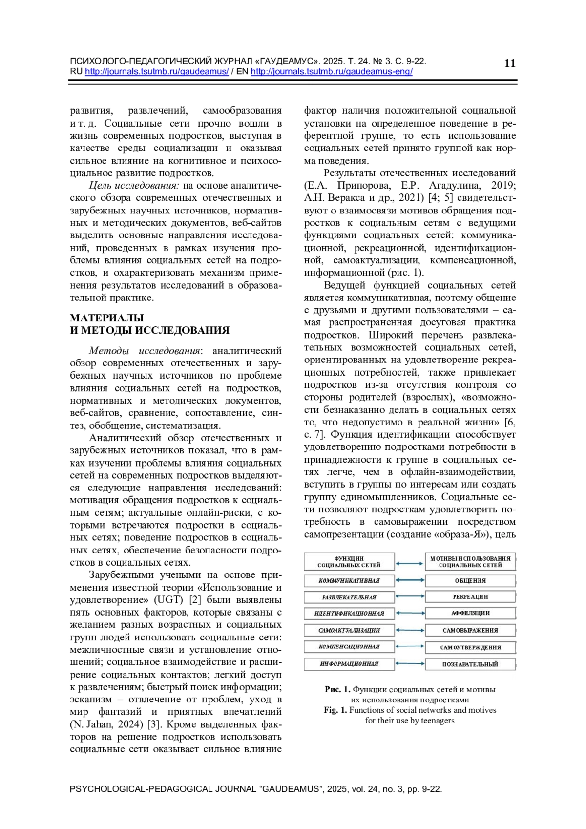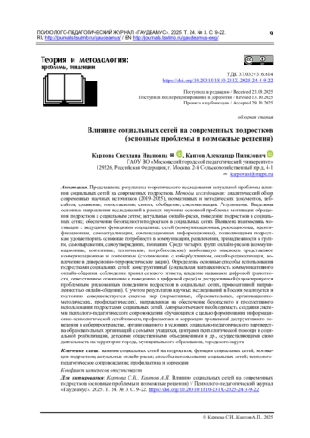 Представлены результаты теоретического исследования актуальной проблемы влияния социальных сетей на современных подростков. Методы исследования: аналитический обзор современных научных источников (2019–2025), нормативных и методических документов, вебсайтов, сравнение, сопоставление, синтез, обобщение, систематизация. Результаты. Выделены основные направления исследований в рамках изучения основной проблемы: мотивация обращения подростков к социальным сетям; актуальные онлайн-риски, поведение подростков в социальных сетях; обеспечение безопасности подростков в социальных сетях. Выявлена взаимосвязь мотивации с ведущими функциями социальных сетей (коммуникационная, рекреационная, идентификационная, самоактуализации, компенсационная, информационная), позволяющими подросткам удовлетворить основные потребности в коммуникации, развлечении, принадлежности к группе, самовыражении, самоутверждении, познании. Среди четырех групп онлайн-рисков (коммуникационные, контентные, технические, потребительские) наибольшую опасность представляют коммуникационные и контентные (столкновение с кибербуллингом, онлайн-радикализация, вовлечение в диверсионно-террористические акции). Определены основные способы использования подростками социальных сетей: конструктивный (социальная направленность коммуникативного онлайн-общения, соблюдение правил сетевого этикета, владение навыками цифровой грамотности, ответственное отношение к поведению в цифровой среде) и деструктивный (характеризуется проблемным, рискованным поведением подростков в социальных сетях, провокативной направленностью онлайн-общения). С учетом результатов научных исследований в России реализуется и постоянно совершенствуется система мер (нормативных, образовательных, организационнометодических, профилактических), направленная на обеспечение безопасного и продуктивного использования подростками социальных сетей. Авторы отмечают необходимость создания системы психолого-педагогического сопровождения обучающихся с целью формирования информационно-психологической устойчивости, профилактики и коррекции проявлений деструктивного поведения в киберпространстве, организованного в условиях социально-педагогического партнерства образовательных организаций с семьями учащихся, центрами психологической помощи и социальной реабилитации, детскими общественными объединениями и др., осуществляющими свою деятельность на территории города, муниципального образования, городского округа.