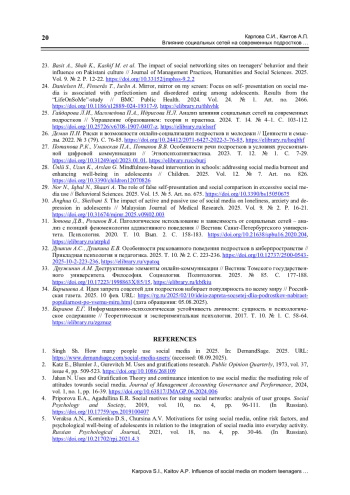 29. Nor N., Iqbal N., Shaari A. The role of false self-presentation and social comparison in excessive social media use // Behavioral Sciences. 2025. Vol. 15. № 5. Art. no. 675. DOI: 10.3390/bs15050675