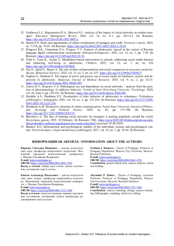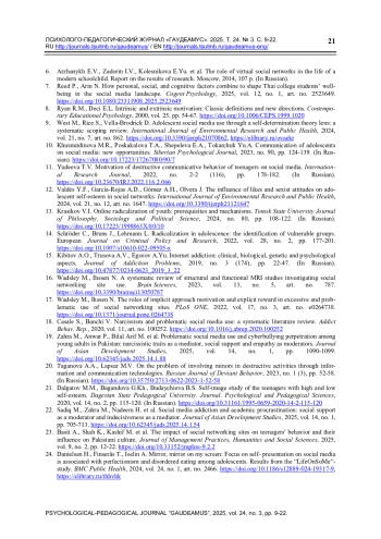 25. Гайдарова Л.И., Магомедова П.А., Идрисова Н.Л. Анализ влияния социальных сетей на современных подростков // Управление образованием: теория и практика. 2024. Т. 14. № 4-1. С. 103-112. ,. DOI: 10.25726/v6708-1907-0407-z