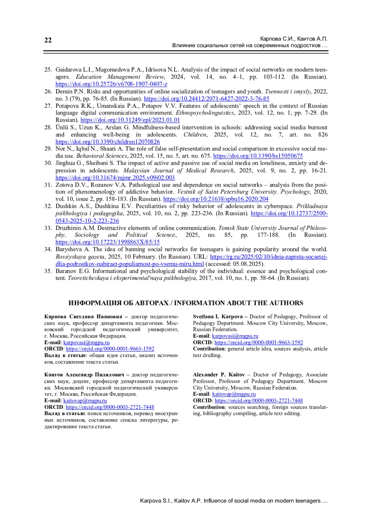 26. Демин П.Н. Риски и возможности онлайн-социализации подростков и молодежи // Ценности и смыслы. 2022. № 3 (79). С. 76-85. ,. DOI: 10.24412/2071-6427-2022-3-76-85