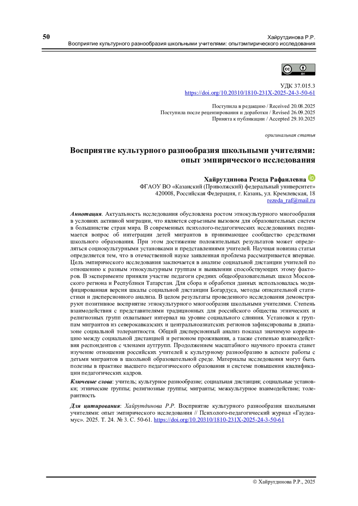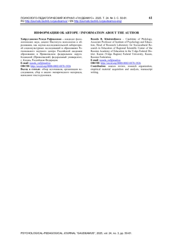 1. Хайрутдинова Р.Р., Громова Ч.Р. Школьный климат в контексте культурного разнообразия: теоретико-эмпирический анализ // Казанский педагогический журнал. 2025. Т. 31. № 1. С. 58-79. ,. DOI: 10.11621/KPJ-25-04