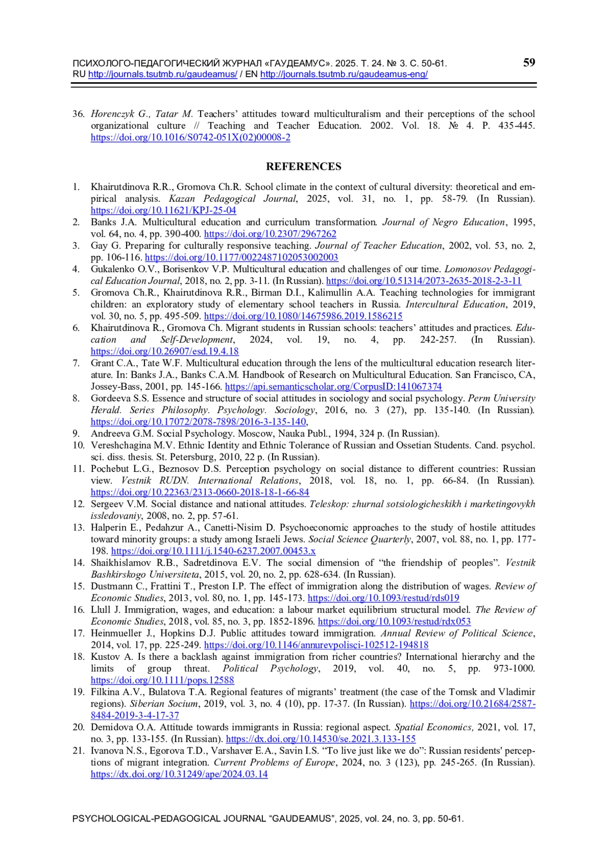 36. Horenczyk G., Tatar M. Teachers’ attitudes toward multiculturalism and their perceptions of the school organizational culture // Teaching and Teacher Education. 2002. Vol. 18. № 4. P. 435-445. DOI: 10.1016/S0742-051X(02)00008-2