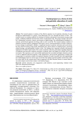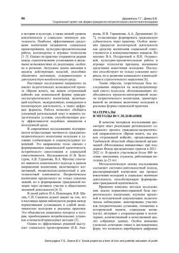 Целью исследования является анализ эффективных практик гражданскопатриотического воспитания молодежи на примере проекта «Время вспять, мы живем отгремевшей войной». Исследование направлено на выявление условий для формирования гражданской идентичности и патриотического сознания у молодежи, объединение традиционных и инновационных форм воспитательной работы. Проект включает клубную работу, волонтерство, экскурсии, конкурсы и элементы цифрового проектирования. Методологической основой выступает системно-деятельностный подход, основанный на включении молодежи в активную социальную жизнь. Использованы методы анализа нормативных документов, педагогического наблюдения, анкетирования и фиксации результатов, что позволяет объективно оценивать изменения в сознании участников. Выделяется значительный рост патриотической мотивации и социальной активности среди молодежи. Участники проявили интерес к изучению истории, сохранению культурного наследия и участию в общественных мероприятиях. Полученные выводы имеют важное научно-практическое значение для дальнейшего совершенствования системы патриотического воспитания молодежи, особенно в аспекте интеграции традиционных и инновационных форм работы, популяризации патриотических идей и поддержки социально активных молодежных движений. Данный опыт может быть успешно внедрен в систему среднего и высшего образования, а также применяться в программах дополнительного образования, молодежных движениях и некоммерческих организаций, работающих с молодежью. Подводя итог исследования, следует подчеркнуть, что современное гражданскопатриотическое воспитание молодежи возможно лишь при условии внедрения новых методик, основанных на комплексе разных видов деятельности, усиливающих личные качества молодых людей и развивающих их способность действовать совместно на благо общего будущего. Именно такая позиция позволит российским гражданам оставаться единым народом, имеющим глубокие корни и прочную связь с историей своей Родины.
