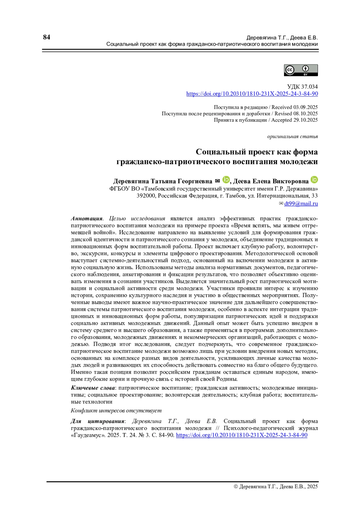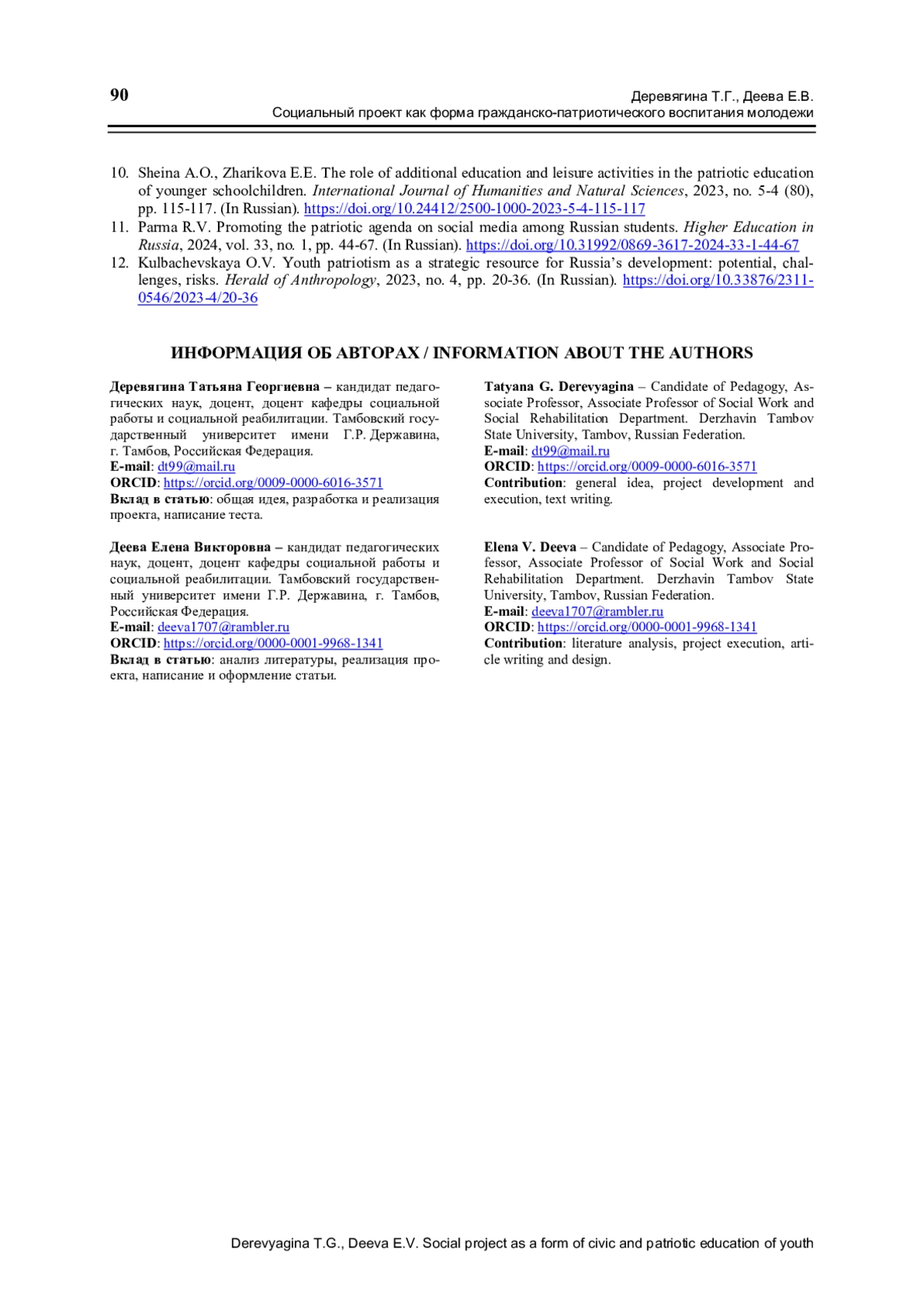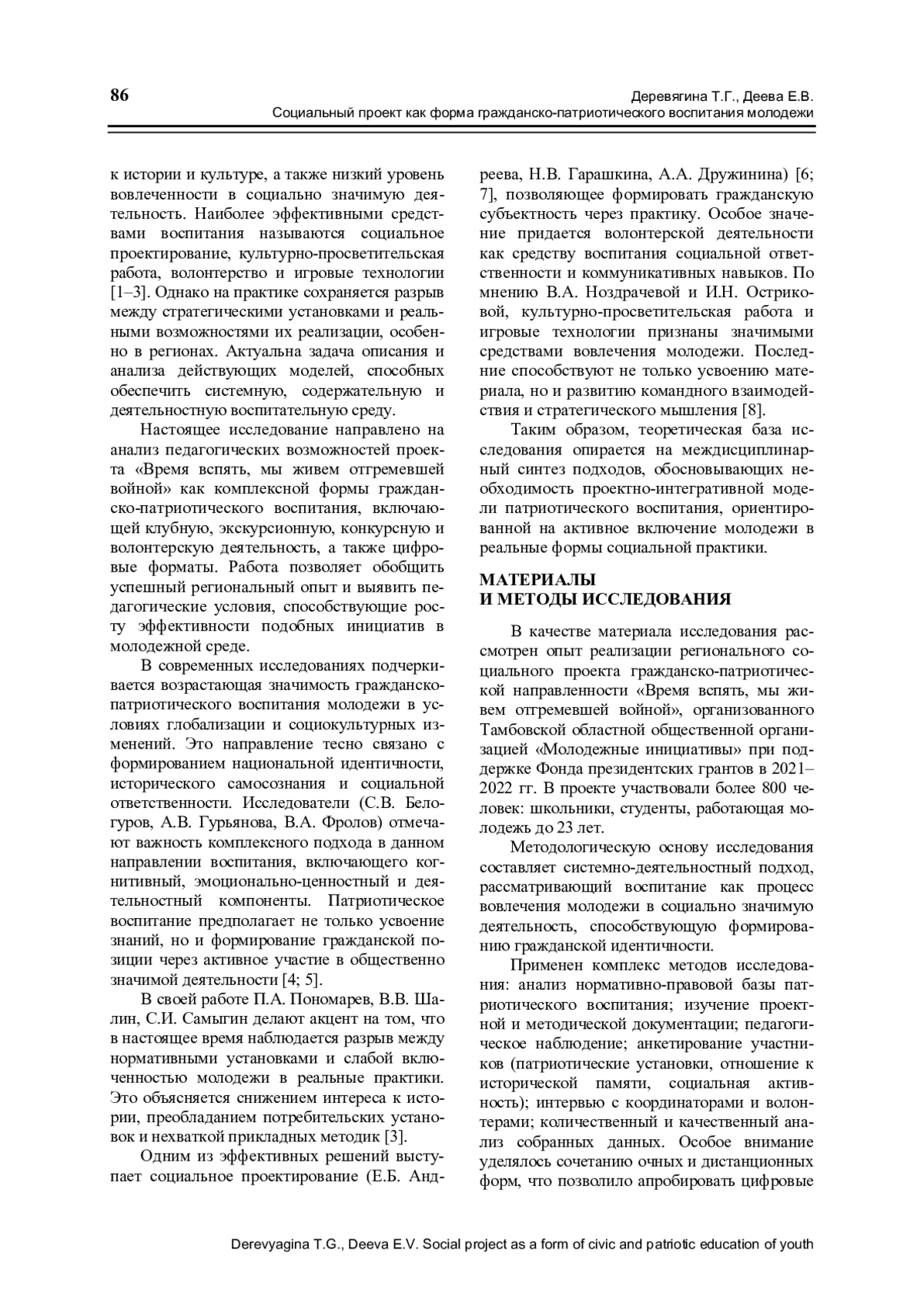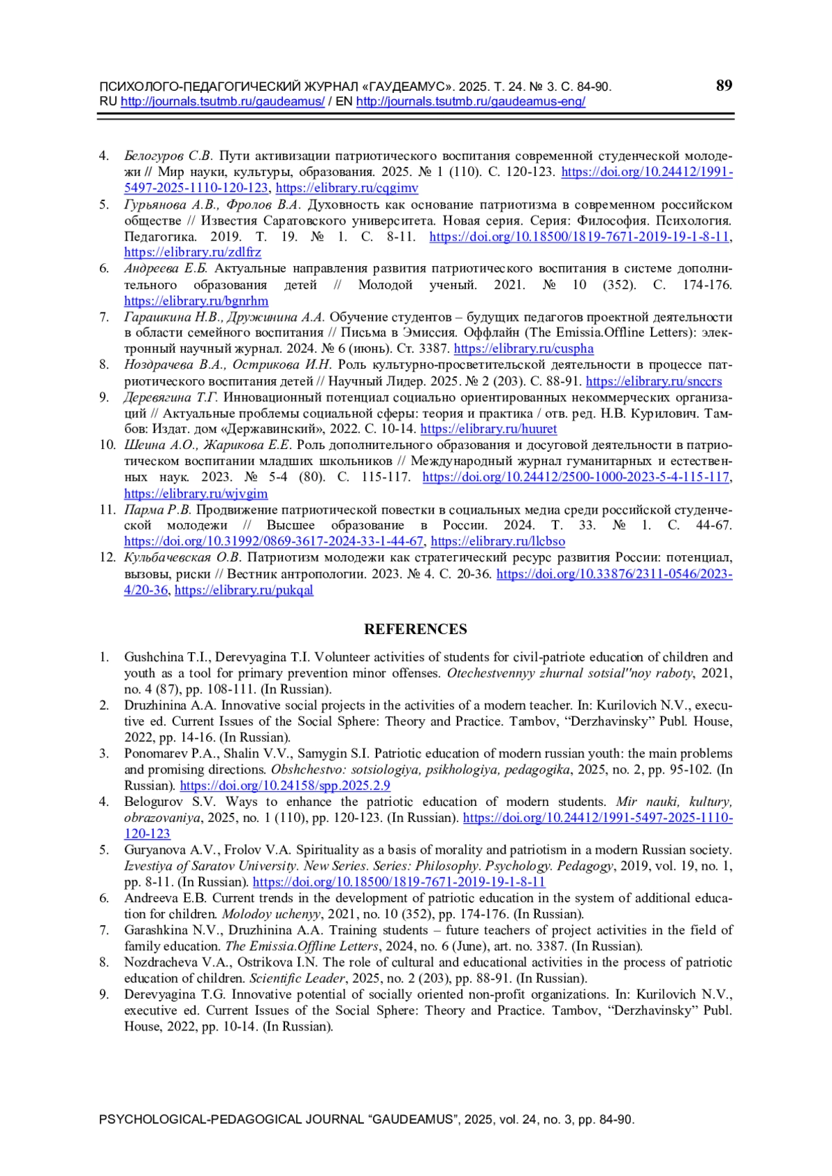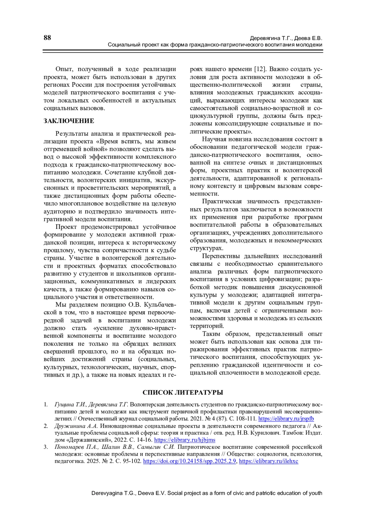 1. Гущина Т.И., Деревягина Т.Г. Волонтерская деятельность студентов по гражданско-патриотическому воспитанию детей и молодежи как инструмент первичной профилактики правонарушений несовершеннолетних // Отечественный журнал социальной работы. 2021. № 4 (87). С. 108-111.