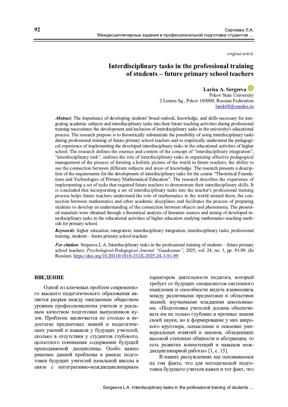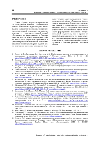 13. Сергеева Л.А. Междисциплинарные задачи как средство интеграции учебных дисциплин в рамках профессиональной подготовки будущего учителя // Преподаватель высшей школы: традиции, проблемы, перспективы. Тамбов: Издат. дом “Державинский”, 2024. С. 140-145.