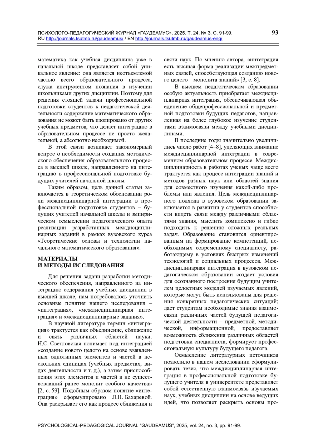 Значимость в процессе профессиональной подготовки будущего педагога формирования у студентов широкого кругозора, развития знаний и навыков, необходимых для интеграции учебных предметов и организации междисциплинарной работы в дальнейшей педагогической деятельности, приводит к необходимости разработки и включения в образовательный процесс вуза междисциплинарных заданий. Цель статьи заключается в теоретическом обосновании возможности использования междисциплинарных заданий в профессиональной подготовке будущего учителя начальной школы при изучении математического и методического содержания и эмпирическом осмыслении педагогического опыта реализации разработанных междисциплинарных заданий в образовательной деятельности высшей школы. В исследовании определена сущность и содержание понятия «междисциплинарная интеграция», «междисциплинарное задание», обозначена роль междисциплинарных заданий в организации эффективного педагогического управления процессом формирования у будущих учителей целостной картины мира, способности видеть взаимосвязь между различными дисциплинами и областями знаний. Представлено описание требований к разработке междисциплинарных заданий при изучении курса «Теоретические основы и технологии начального математического образования». Описан опыт реализации разработанного комплекса заданий, выполнение которых требовало от студентов-будущих учителей демонстрации навыков междисциплинарной работы. Сформулирован вывод о том, что включение в процесс профессиональной подготовки педагога комплекса междисциплинарных заданий способствует достижению понимания будущими учителями роли математики в познании окружающего мира, связи математики с другими учебными дисциплинами и облегчает процесс подготовки студента к формированию у будущих воспитанников представлений о связях между изучаемыми объектами и явлениями. Представленные в статье материалы получены с помощью теоретического анализа литературных источников, апробации разработанных междисциплинарных заданий в образовательной деятельности высшей школы при изучении методики преподавания математики в начальной школе.