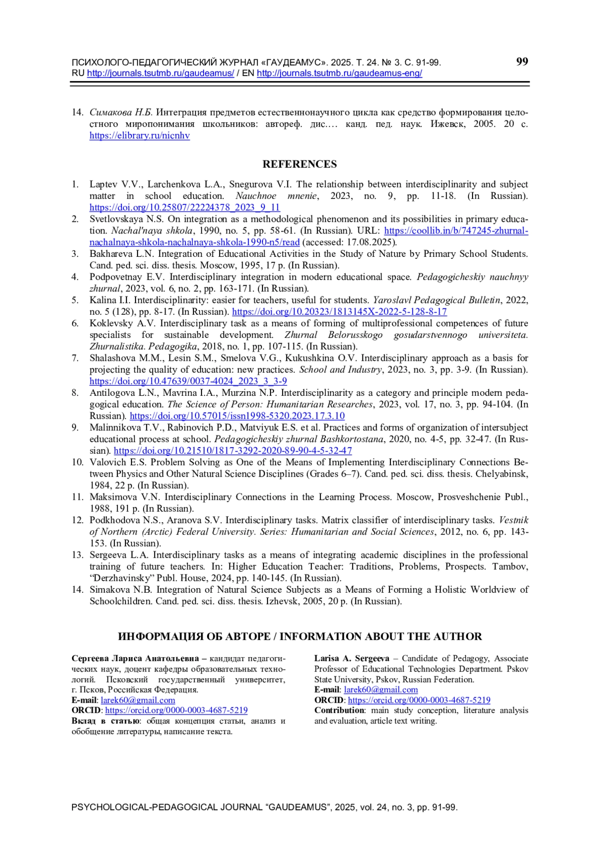 1. Лаптев В.В., Ларченкова Л.А., Снегурова В.И. Проблема соотношения междисциплинарности и предметности в школьном образовании // Научное мнение. 2023. № 9. С. 11-18. ,. DOI: 10.25807/22224378_2023_9_11