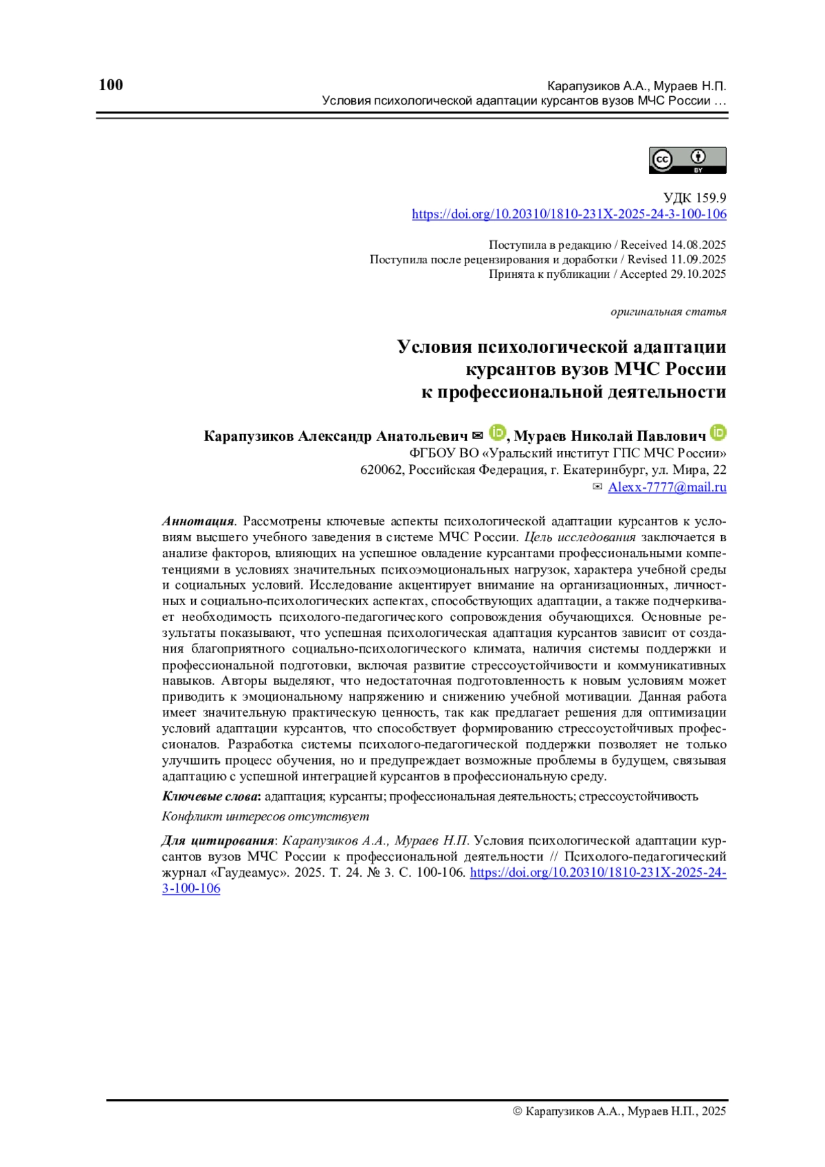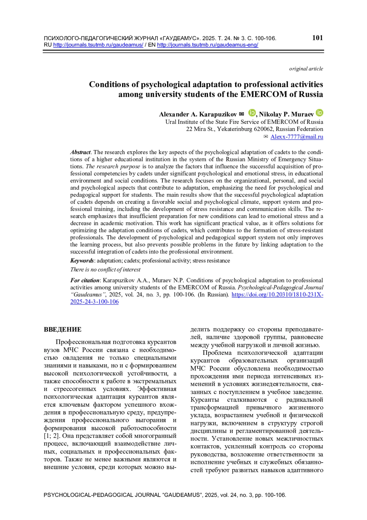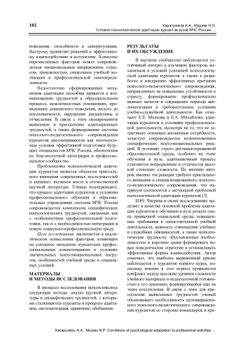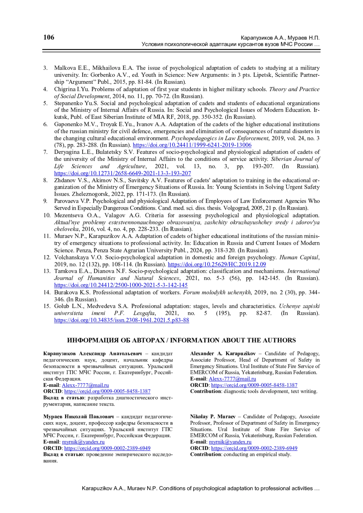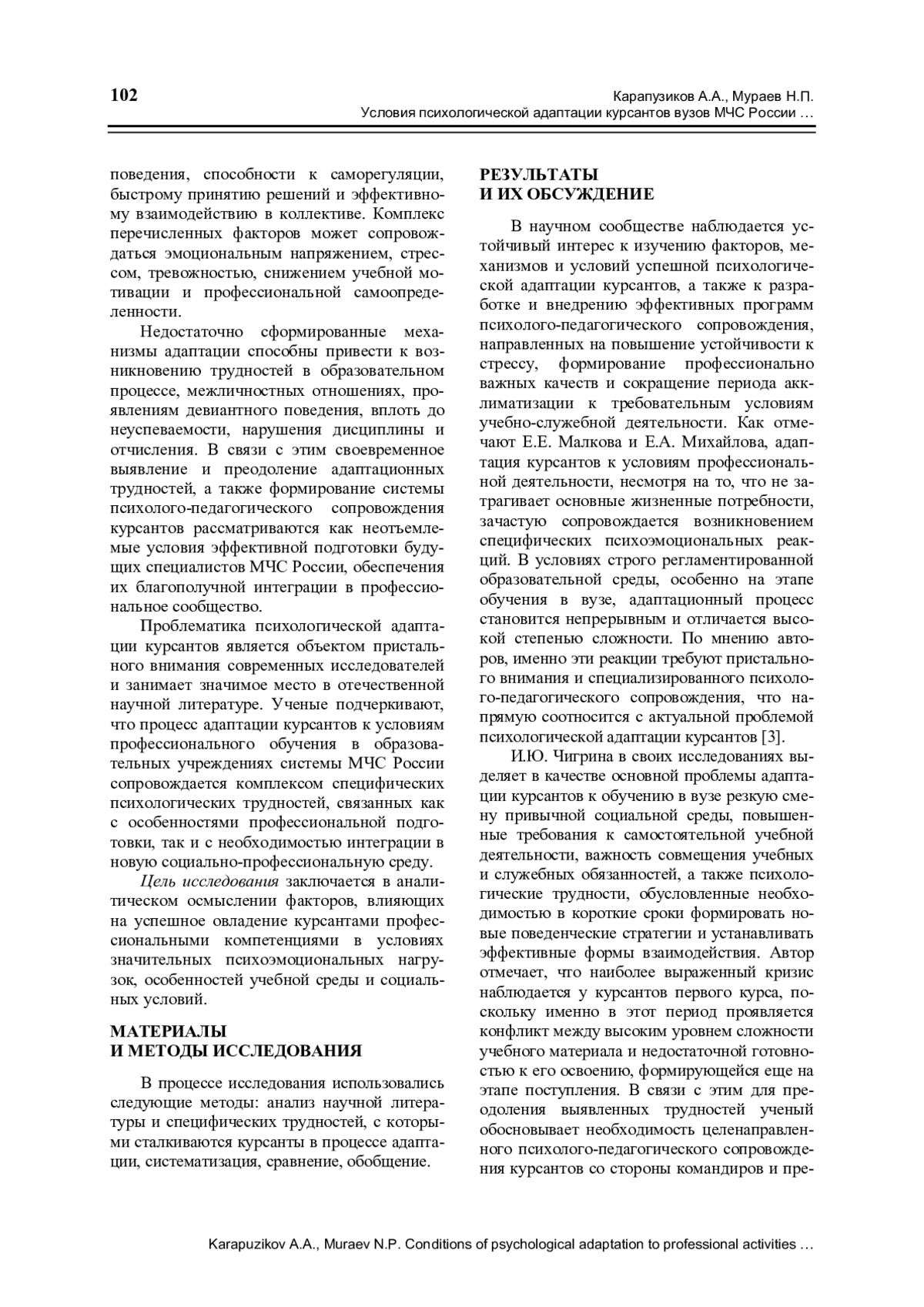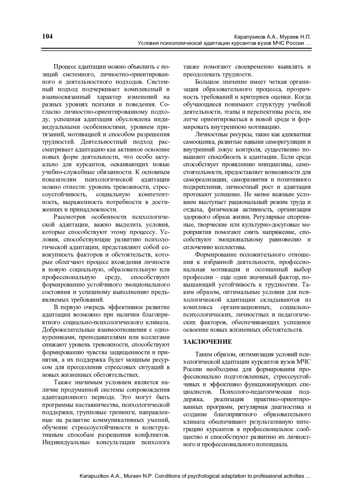 11. Мураев Н.П., Карапузиков А.А. Адаптация курсантов вузов МЧС России к профессиональной деятельности // Образование России и актуальные вопросы современной науки. Пенза: ПГАУ, 2024. С. 318-320.