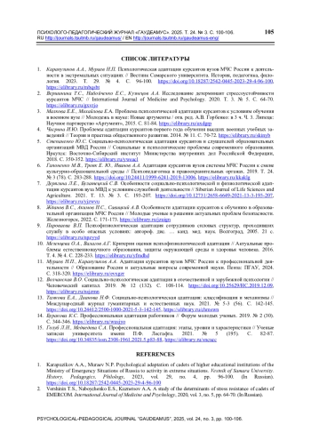 1. Карапузиков А.А., Мураев Н.П. Психологическая адаптация курсантов вузов МЧС России к деятельности в экстремальных ситуациях // Вестник Самарского университета. История, педагогика, филология. 2023. Т. 29. № 4. С. 96-100. ,. DOI: 10.18287/2542-0445-2023-29-4-96-100