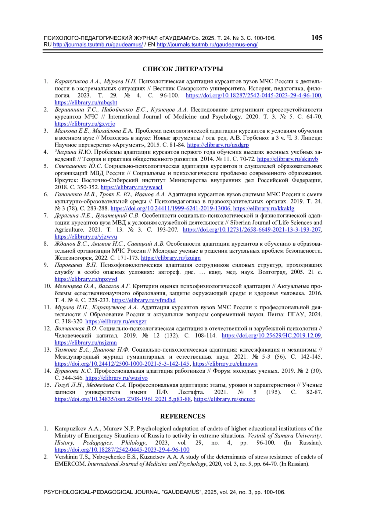 7. Дерягина Л.Е., Булатецкий С.В. Особенности социально-психологической и физиологической адаптации курсантов вуза МВД к условиям служебной деятельности // Siberian Journal of Life Sciences and Agriculture. 2021. Т. 13. № 3. С. 193-207. ,. DOI: 10.12731/2658-6649-2021-13-3-193-207