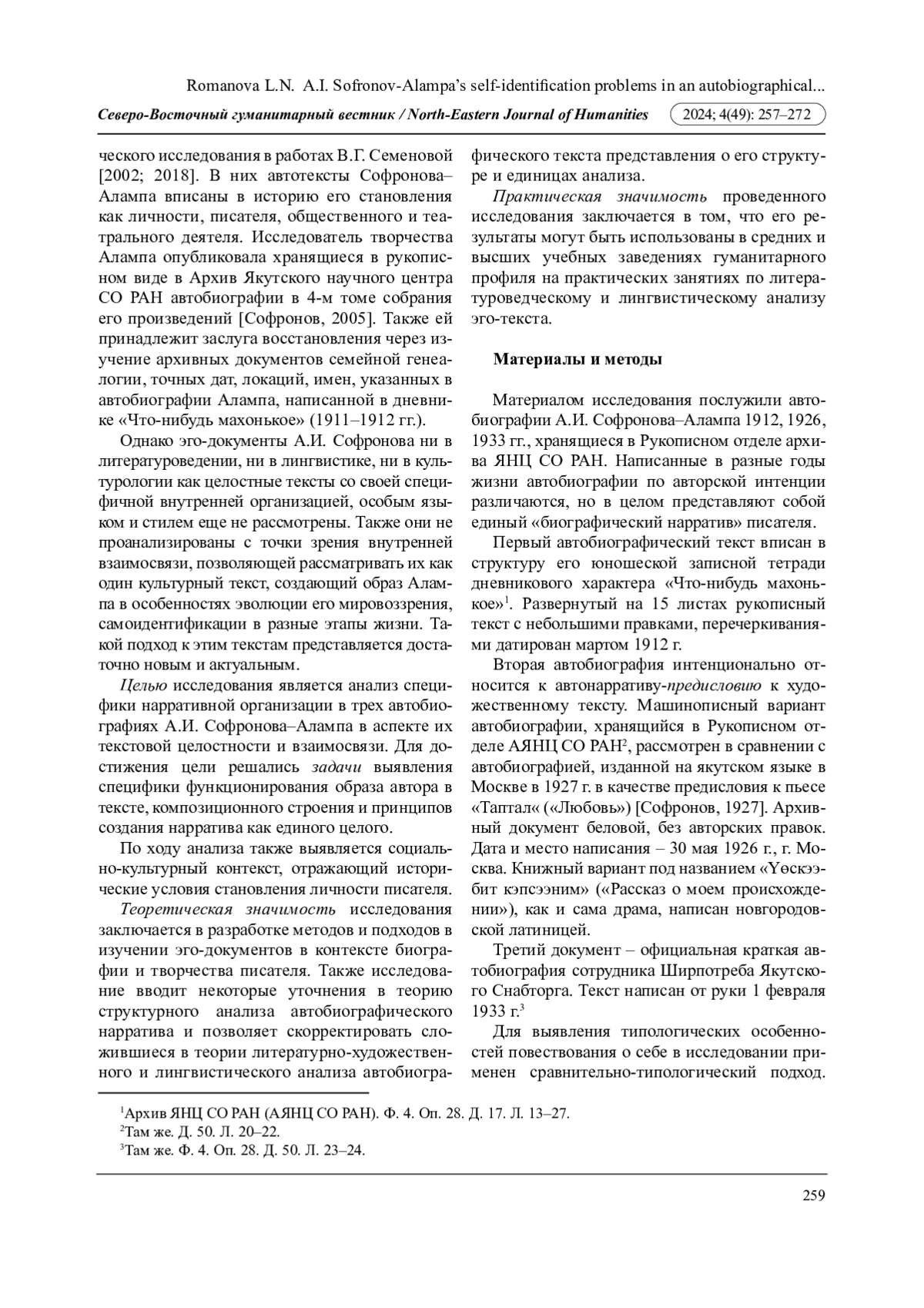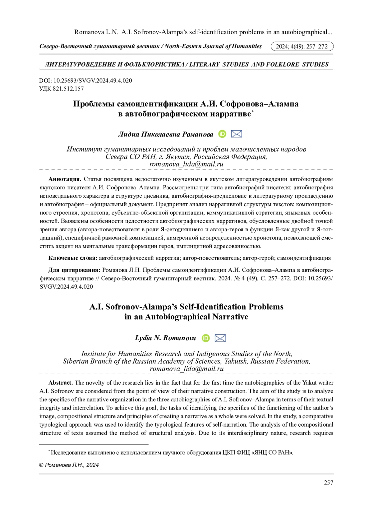 Статья посвящена недостаточно изученным в якутском литературоведении автобиографиям якутского писателя А. И. Софронова-Алампа. Рассмотрены три типа автобиографий писателя: автобиография исповедального характера в структуре дневника, автобиография-предисловие к литературному произведению и автобиография - официальный документ. Предпринят анализ нарративной структуры текстов: композиционного строения, хронотопа, субъектно-объектной организации, коммуникативной стратегии, языковых особенностей. Выявлены особенности целостности автобиографических нарративов, обусловленные двойной точкой зрения автора (автора-повествователя в роли Я-сегодняшнего и автора-героя в функции Я-как другой и Я-тогдашний), специфичной рамочной композицией, намеренной неопределенностью хронотопа, позволяющей сместить акцент на ментальные трансформации героя, имплицитной адресованностью.
