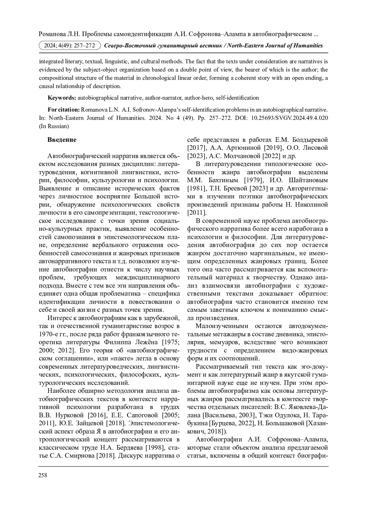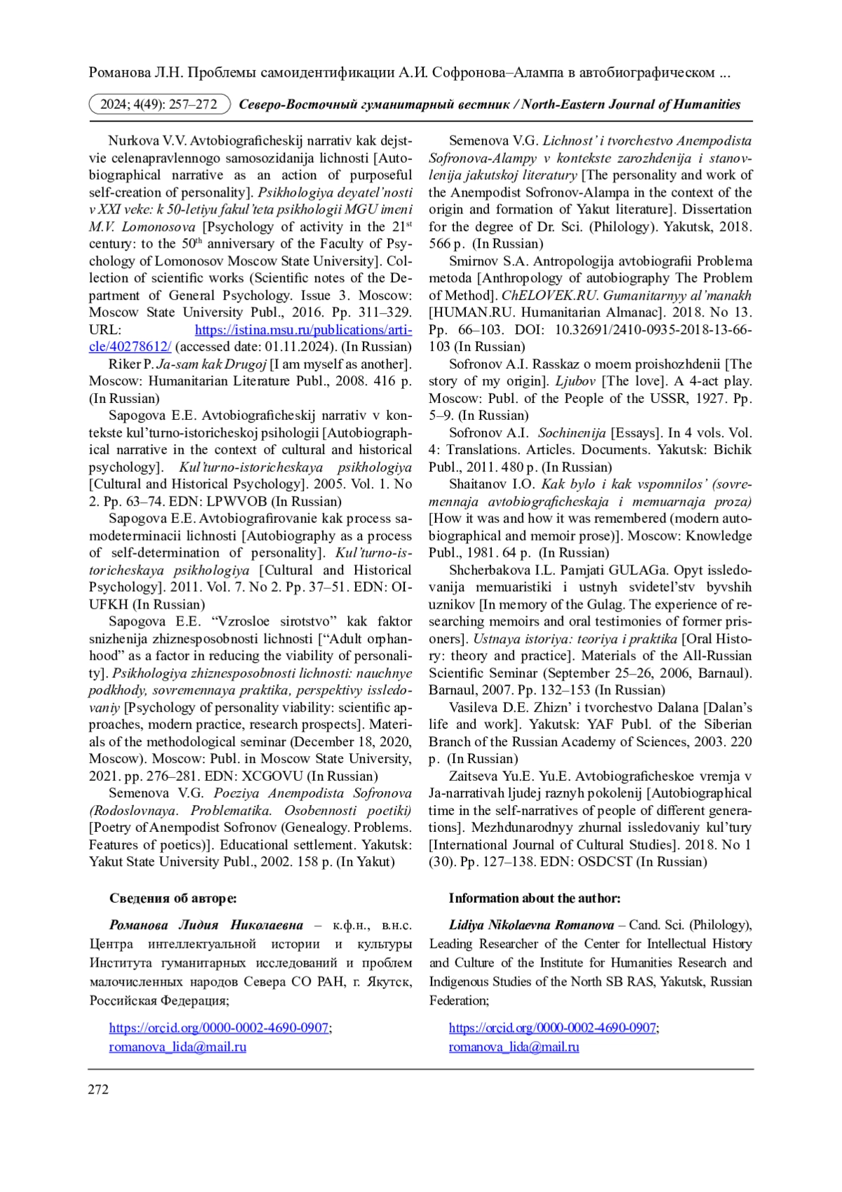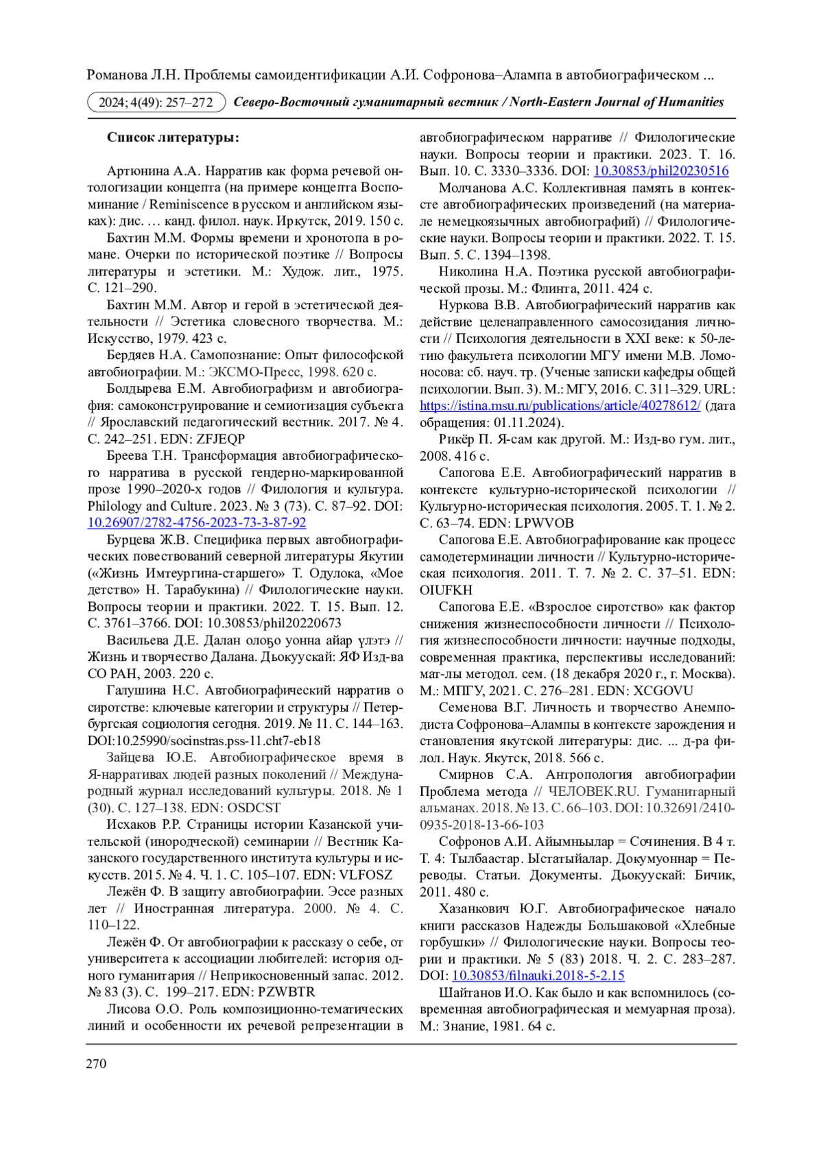 6. Бурцева Ж.В. Специфика первых автобиографических повествований северной литературы Якутии (“Жизнь Имтеургина-старшего” Т. Одулока, “Мое детство” Н. Тарабукина) // Филологические науки. Вопросы теории и практики. 2022. Т. 15. Вып. 12. С. 3761-3766. DOI: 10.30853/phil20220673 EDN: SEPJEI