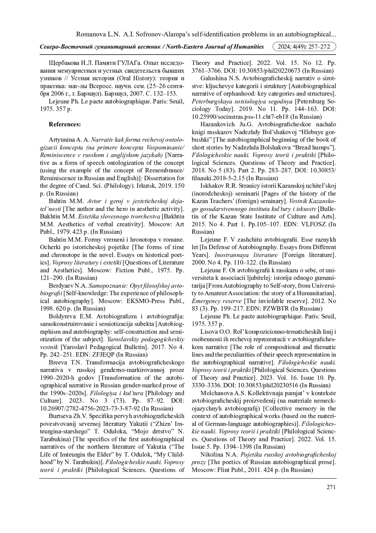 14. Лисова О.О. Роль композиционно-тематических линий и особенности их речевой репрезентации в автобиографическом нарративе // Филологические науки. Вопросы теории и практики. 2023. Т. 16. Вып. 10. С. 3330-3336. DOI: 10.30853/phil20230516 EDN: SBXWDF