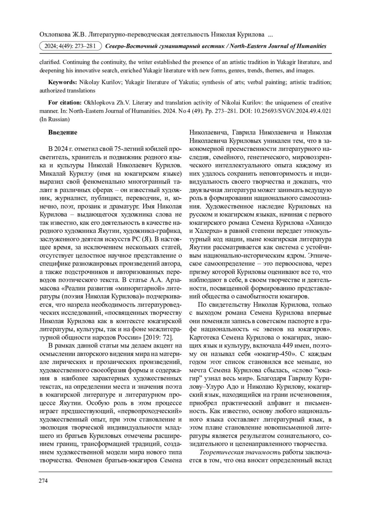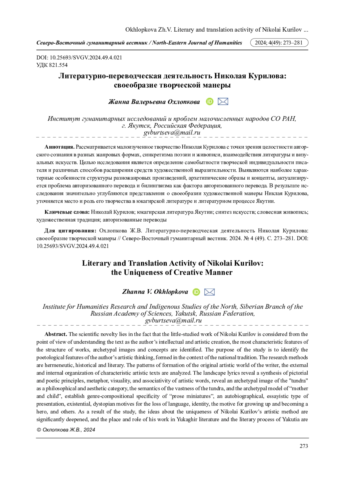 Целью исследования является определение самобытности творческой индивидуальности писателя и различных способов расширения средств художественной выразительности. Выявляются наиболее характерные особенности структуры разножанровых произведений, архетипические образы и концепты, актуализируется проблема авторизованного перевода и билингвизма как фактора авторизованного перевода. В результате исследования значительно углубляются представления о своеобразии художественной манеры Никлая Курилова, уточняется место и роль его творчества в юкагирской литературе и литературном процессе Якутии.